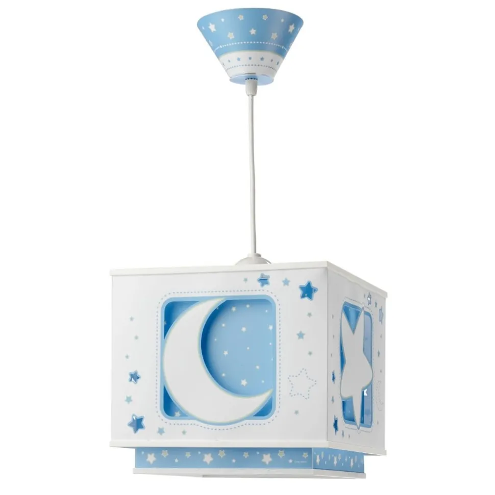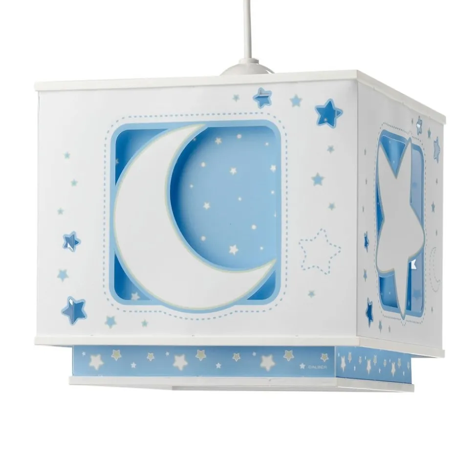 Deze plafondlamp met afbeeldingen van de maan en de sterren nodigt uit om te gaan dromen. Een fluorescerende omranding zorgt ervoor, dat de afbeeldingen ook in het donker oplichten! Gemaakt in Europa