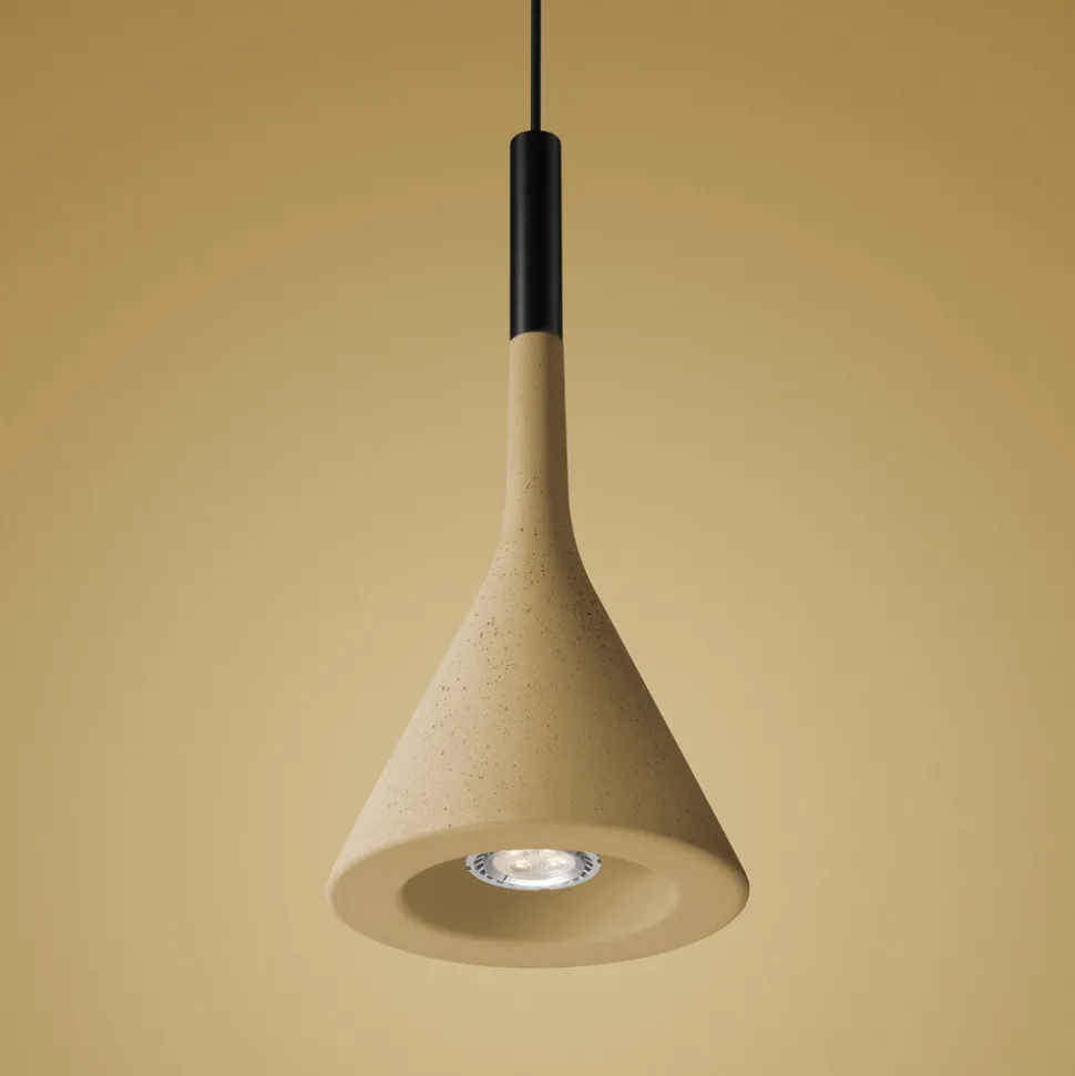De twee Italiaanse ontwerpers Paolo Lucidi en Luca Pevere zijn verantwoordelijk voor dit bijzondere ontwerp, dat voor Foscarini is ontwikkeld. De twee Milanese ontwerpers staan altijd klaar om de uitdaging aan te gaan om nieuwe soorten producten te creëren, altijd op zoek naar nieuwe of ongebruikelijke materialen of productietechnologieën. Aplomp is gemaakt om beton te testen als materiaal voor een armatuur. Een spannende mix van architectonische en designelementen wordt gecombineerd in de afgewerkte pendelarmatuur, die gemaakt is van een speciale cementmix. Door verschillende kleurpigmenten toe te voegen aan het cementmengsel voor de lampenkap ontstaan nieuwe interpretaties van het oorspronkelijk nogal saaie en grijze materiaal.