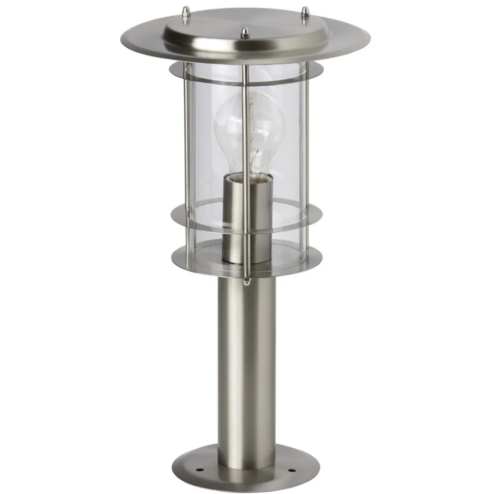 Deze moderne sokkellamp van roestvrij staal heeft een rechte vorm met een slanke armatuur bestaande uit lamellen en dwarsstukken en een behuizing van acrylglas. Hij voldoet aan alle eisen van de beschermingsklasse IP23 en kan uitgerust worden met energiezuinige lampen.