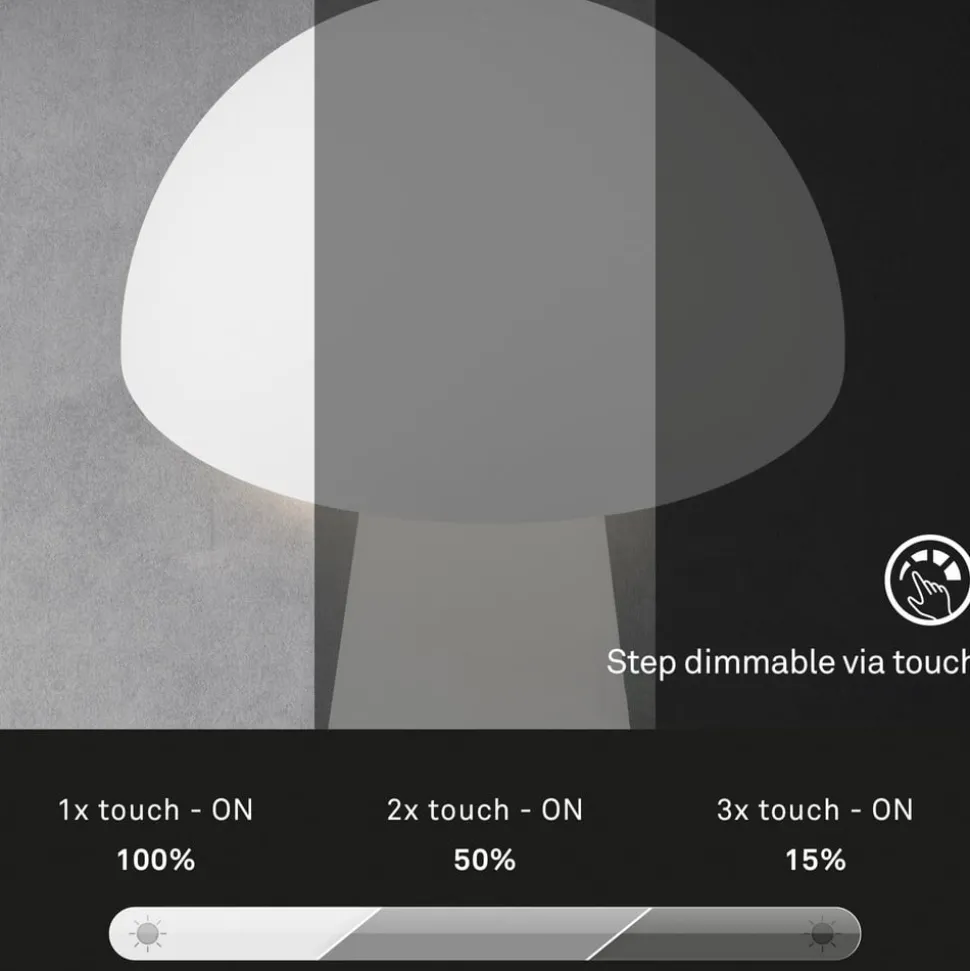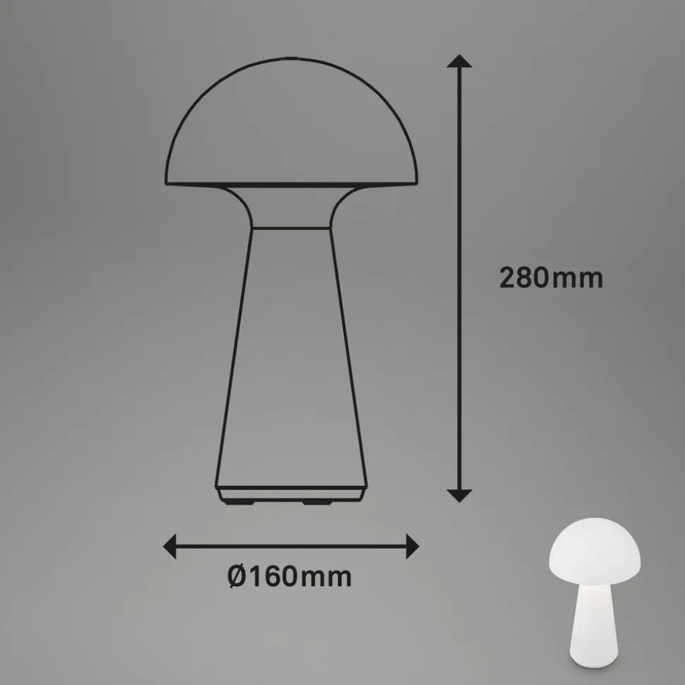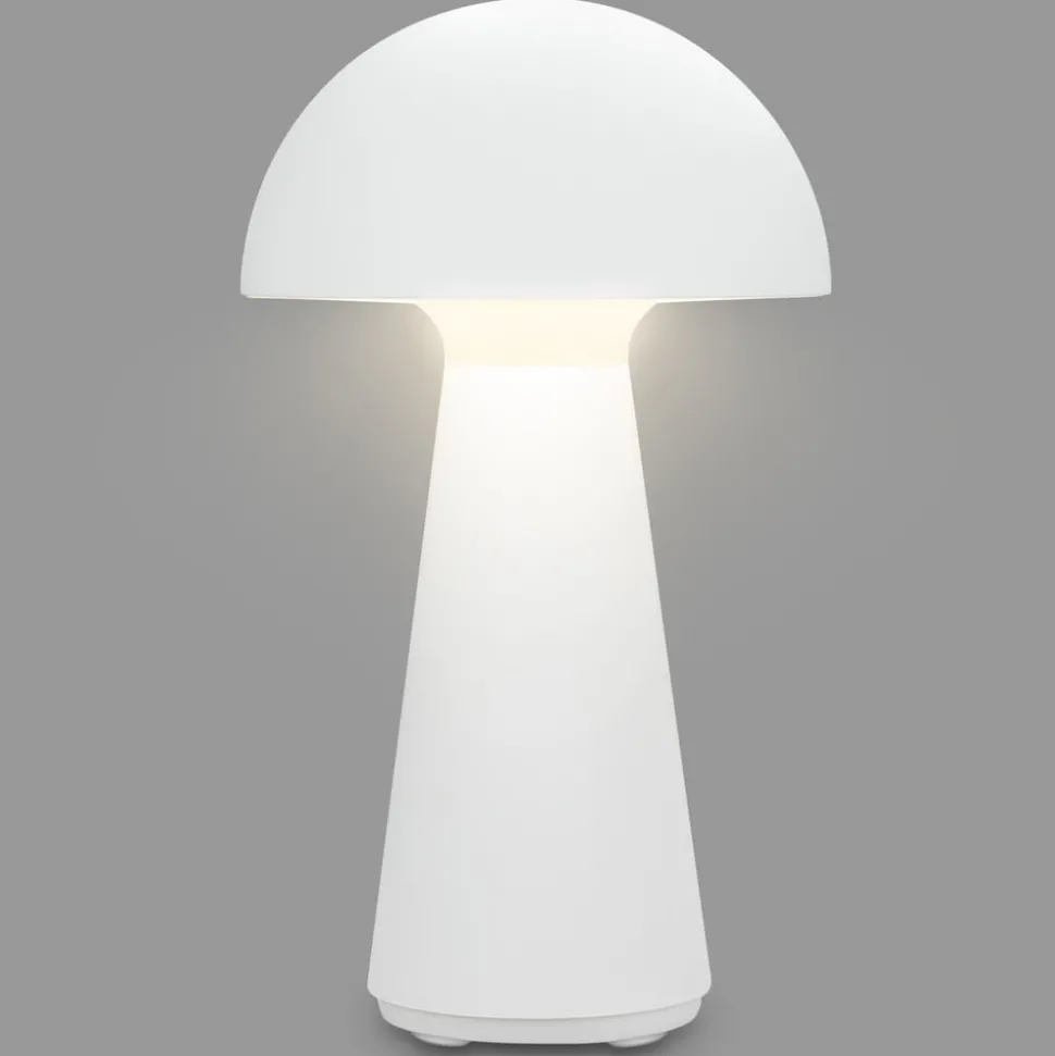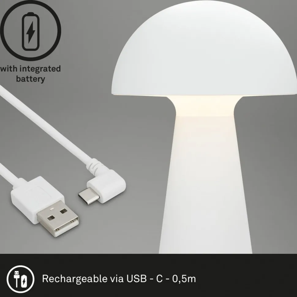LED tafellamp Fungo op batterijen voor binnen en buitenDe LED tafellamp Fungo met geïntegreerde batterij heeft de vorm van een paddenstoel. Hij is gemaakt van kunststof en straalt het warmwitte licht van de geïntegreerde LED’s naar beneden, waardoor een aangename indirecte verlichting ontstaat. Dankzij de werking op batterijen en beschermingsklasse IP44 kan de lamp niet alleen binnen, maar ook buiten worden gebruikt en schijnt ze met een volle batterij in het laagste lichtniveau tot 18 uur lang. De lamp is uitgerust met een touchdimmer en kan op drie helderheidsniveaus worden geschakeld door aanraking. Viltglijders aan de onderkant van de voet beschermen gevoelige oppervlakken tegen krassen. – Levering incl. USB-C oplaadkabel zonder netadapter