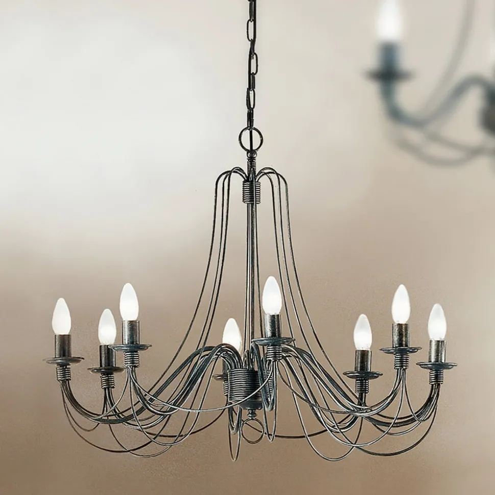 De smeedkunst maakt het mogelijk – acht kaarsen lijken op zwevende koorden te dansen en verspreiden sfeervolle lichtheid. De luchter is met een diameter van 80 cm en 8 lichtbronnen ook geschikt voor grote ruimtes.