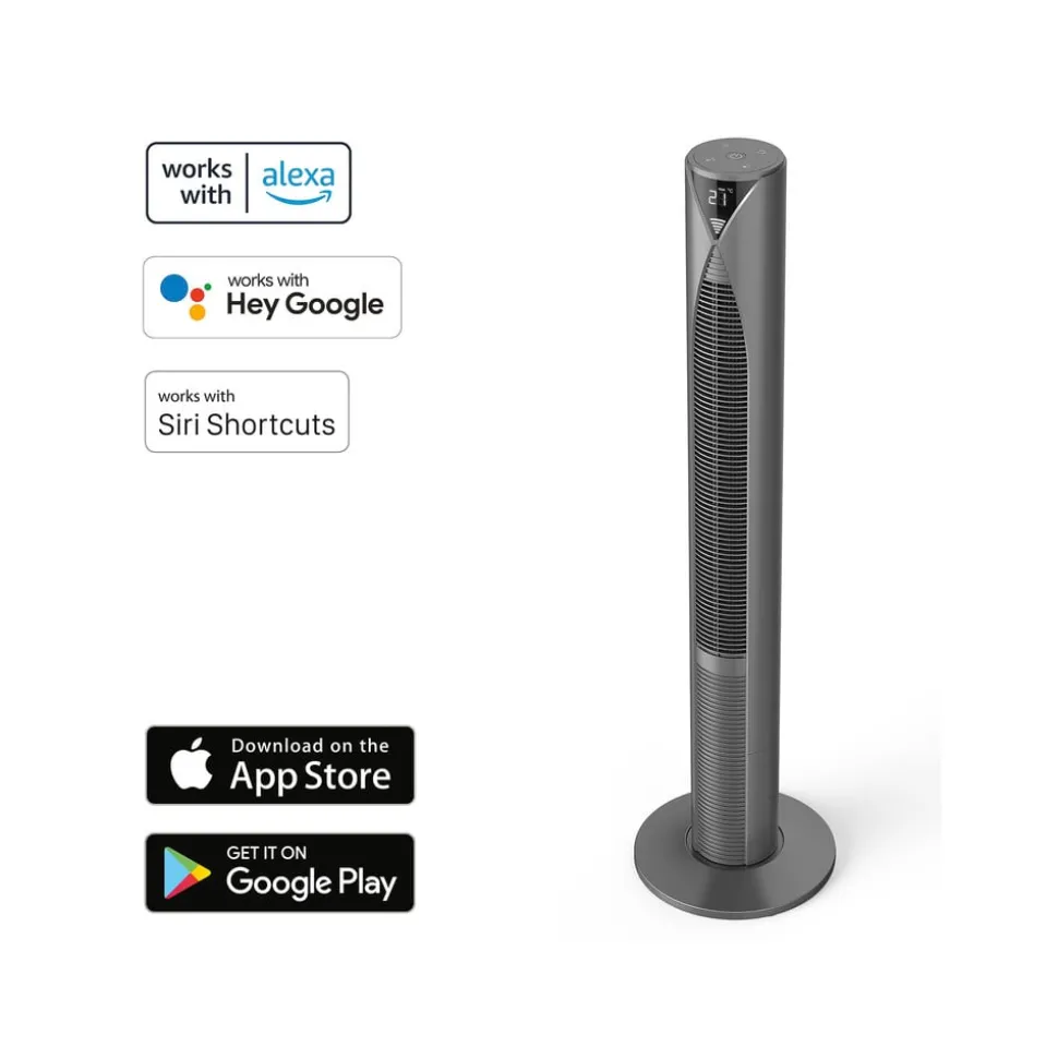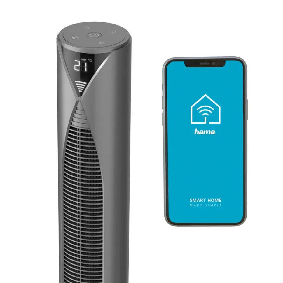 Technische kenmerken / compatibiliteit: – Direct en zonder gateway te bedienen via app en met spraakopdrachten – Gratis app voor iOS en Android – Spraakbesturing met Amazon Alexa, Google Assistant en Apple Siri (sneltoetsen) mogelijk – Te combineren met vele andere smart home-componenten van Hama (zie accessoires) – Maximaal volume: 52 dB Speciale kenmerken: – Inclusief afstandsbediening – 3 instelbare snelheidsniveaus – Geïntegreerde temperatuursensor – Instelbare timer – Instelbare automatische zwenkfunctie (zwenkbereik 80°) – Gegevensopslag uitsluitend op Duitse servers