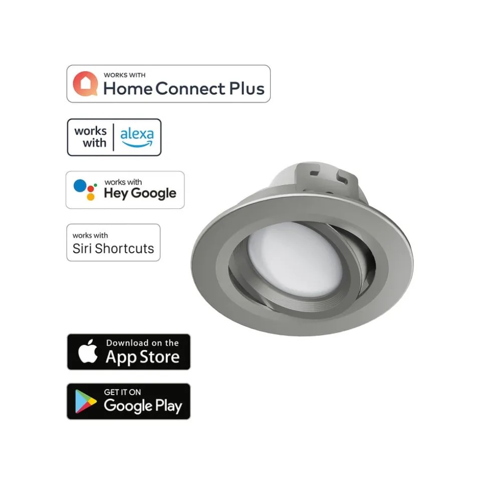 Direct aanstuurbaar via app: Smart LED inbouwspot WLAN, CCT, 120°, draaibaarVoor intelligente lichtsturing is bij de LED inbouwplafondlamp WLAN geen gateway nodig. Deze werkt direct met de gratis Hama Smart Home app, die beschikbaar is voor Android en iOS. De kleurtemperatuur kan traploos worden geregeld van warm wit tot daglicht en ook de helderheid kan traploos worden gedimd. Daarnaast is het mogelijk om vooraf gedefinieerde lichtscènes en timers in te stellen. Aangezien de Hama Smart Home app compatibel is met Amazon Alexa, Google Assistant en Siri (Shortcuts) van Apple, kunnen alle functies ook met spraakopdrachten worden bediend. Daarnaast is deze plafondinbouwspot compatibel met de Home Connect Plus app van Bosch.De spot, die gemaakt is van kunststof, is in één kleur gehouden en is voorzien van een opaalwitte diffuser die zorgt voor een homogene en brede lichtverdeling. De LED-module kan in totaal 30 graden worden gekanteld en heeft een brede stralingshoek.Technische kenmerken / compatibiliteit:- Integratie via wifi; volledig bedienbaar zonder gateway via app en met spraakopdrachten- Gratis app voor iOS en Android- Spraakbesturing met Amazon Alexa, Google Assistant en Apple Siri (sneltoetsen) mogelijk- Compatibel met de Home Connect Plus app van Bosch- Kleurtemperatuur traploos instelbaar: warm wit (2..700 K) tot daglicht (6.500 K)- Continu dimbaar via app en met stemcommando’s- Timer en voorgedefinieerde scènes instelbaar via app- Brede lichtbundel: 120 °- Zwenkbaar met /- 15 °- Gegevensopslag uitsluitend op Duitse serversNoot: Niet compatibel met conventionele wanddimmers.