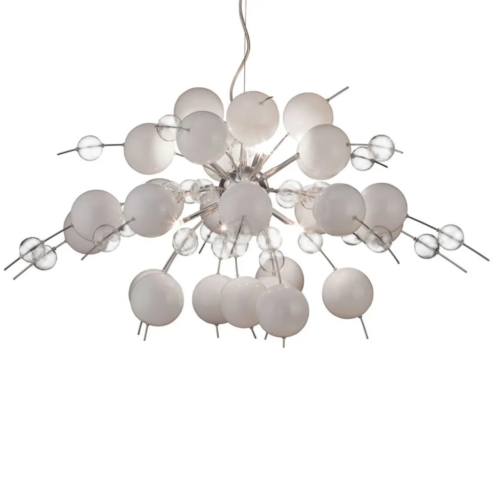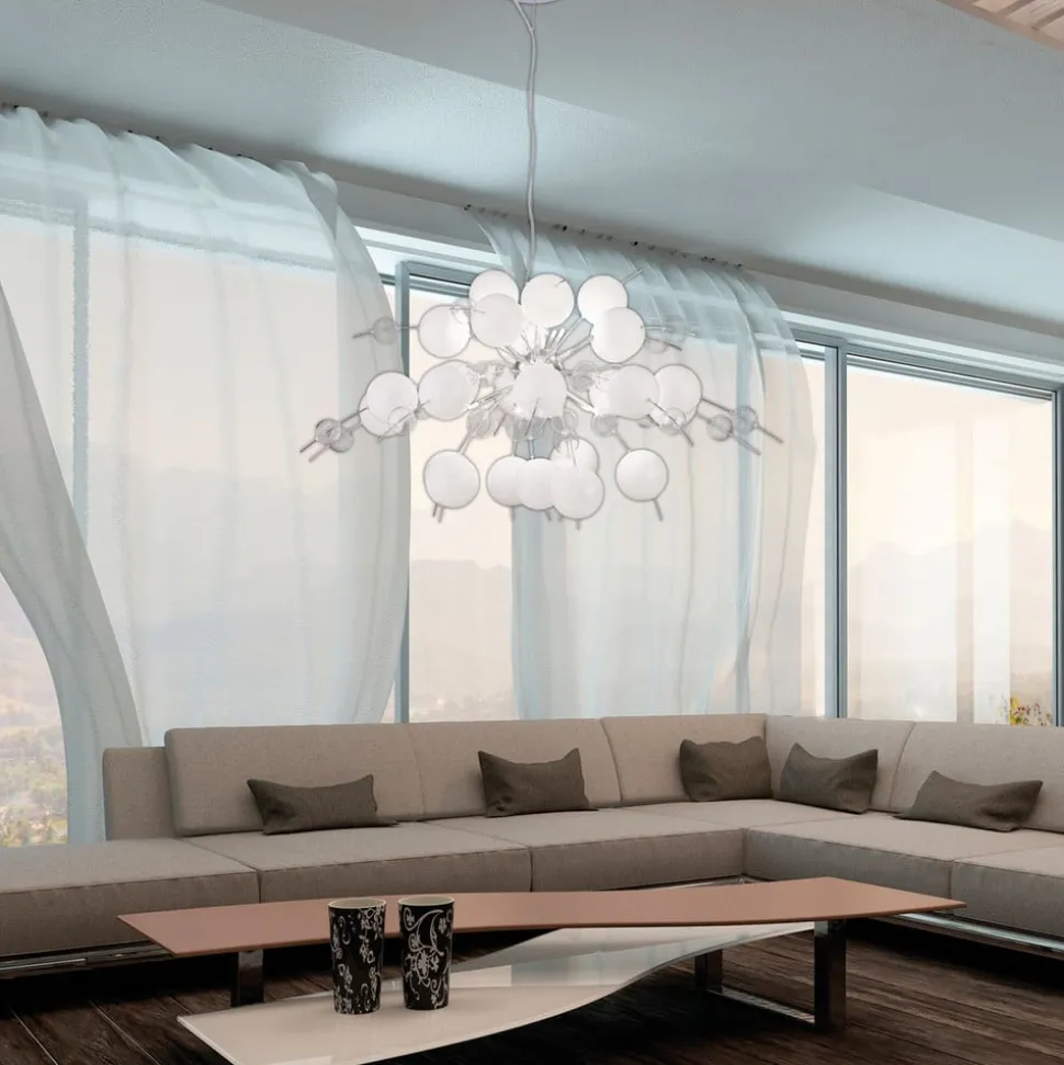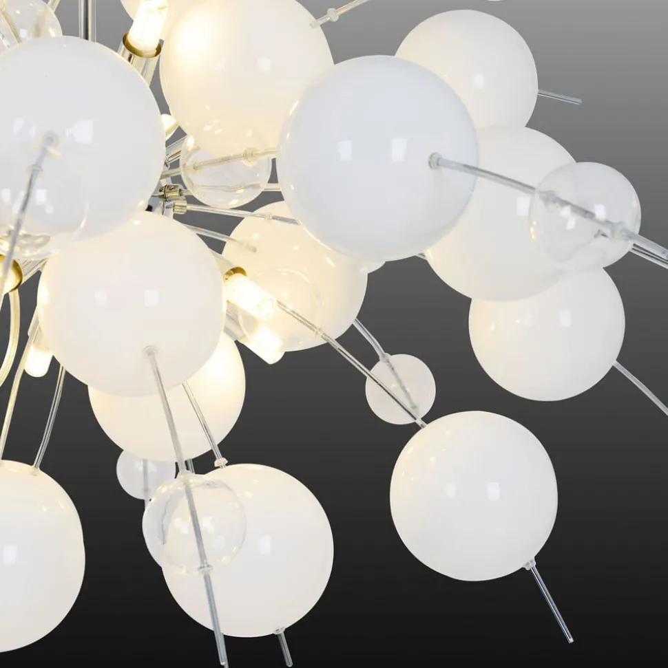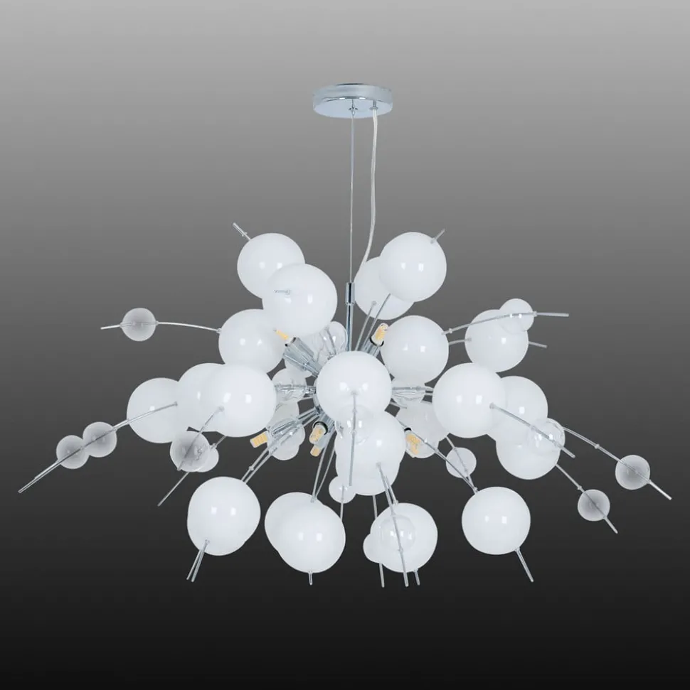 De hanglamp Explosion biedt een bedwelmend vuurwerk van verschillende grote, transparante en witgekleurde glazen bollen. Deze zijn bevestigd aan naar beneden gebogen staven, die vanuit een centrale chromen bol in alle richtingen uitstralen. Tussen de bollen zijn houders voor G9-lampen geplaatst, waardoor de hanglamp Explosion kan schitteren. Vooral in moderne woon- en eetkamers met hoge plafonds is deze lamp een harmonieuze blikvanger.