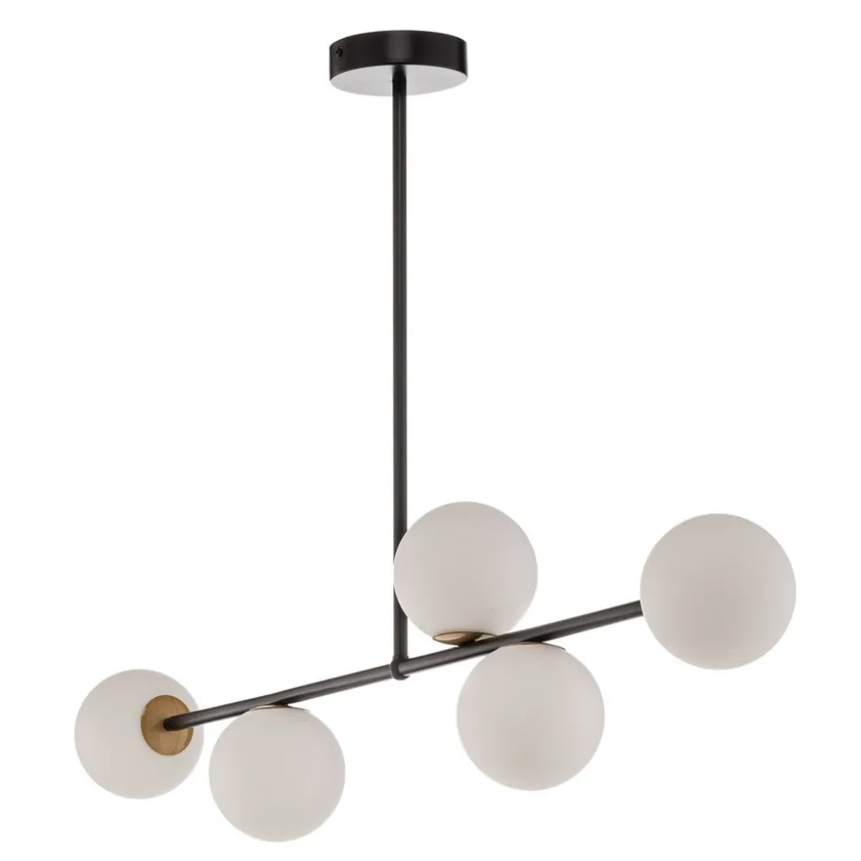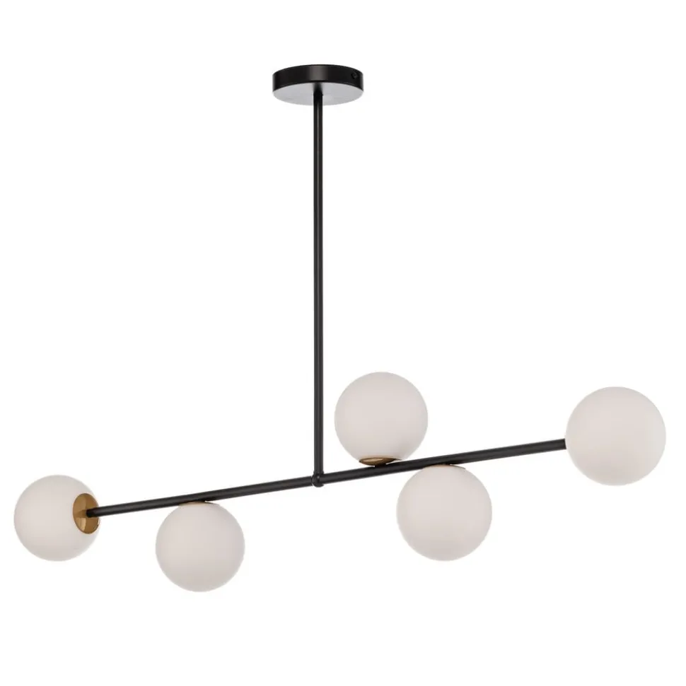 De hanglamp Gama 5, 5-lamps, heeft een modern design dat opvalt door de combinatie van gepoedercoat staal en glas. De kleuren zwart, wit en goud geven de lamp een tijdloze elegantie die naadloos in verschillende interieurconcepten kan worden geïntegreerd. Of het nu in de woonkamer, de keuken of de eetkamer is – deze lamp zet stijlvolle accenten en zorgt voor een aangename verlichtingssfeer.