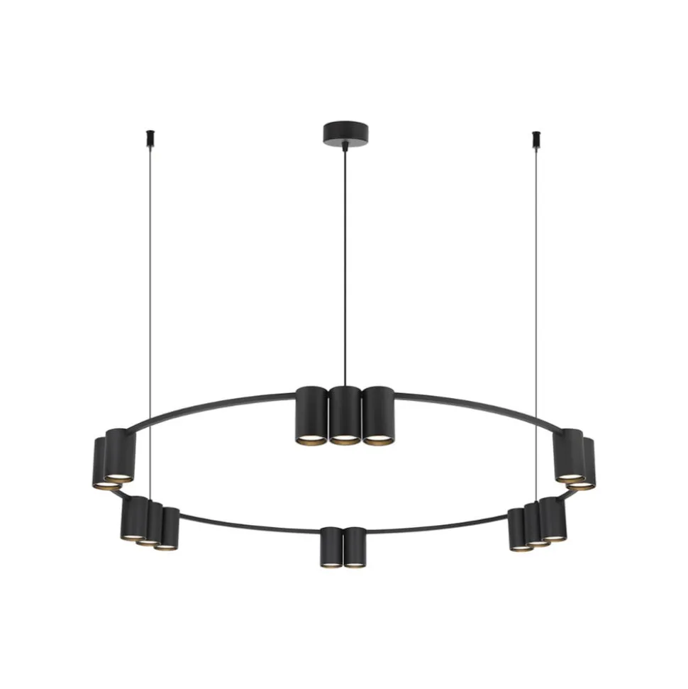De hanglamp Genesis maakt indruk door zijn moderne design en het gebruik van hoogwaardig aluminium in elegant zwart. Door zijn veelzijdigheid is hij ideaal voor verschillende interieurconcepten, of het nu in de woonkamer, eetkamer, keuken of werkkamer is. De lamp biedt plaats aan 15 GU10-lampen, die zorgen voor een gelijkmatige en aangename verlichting.