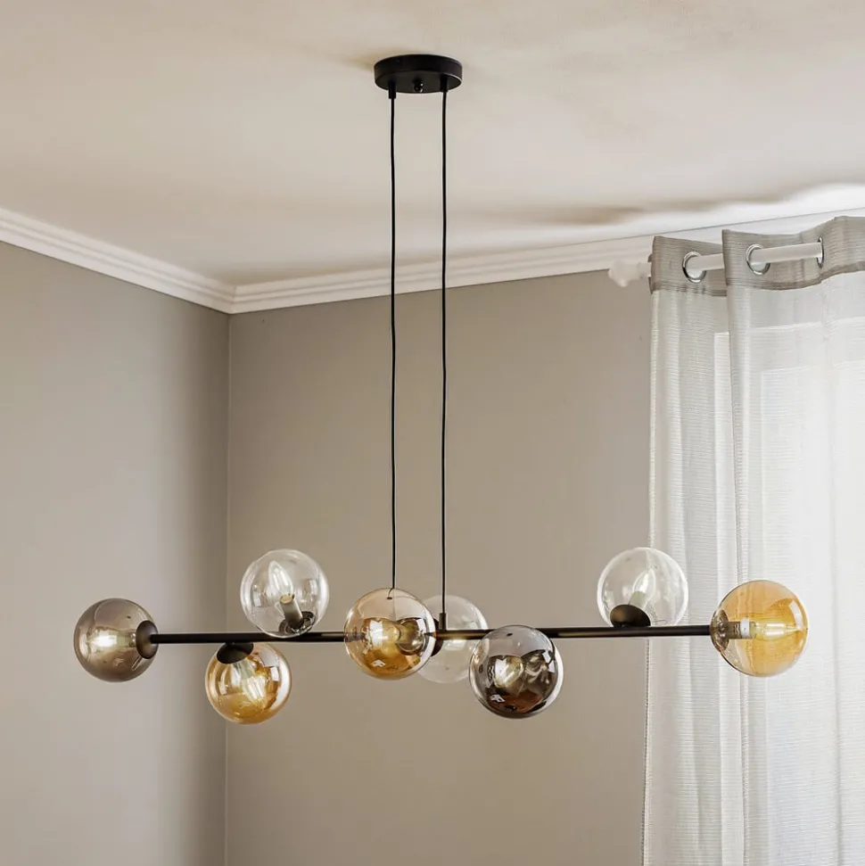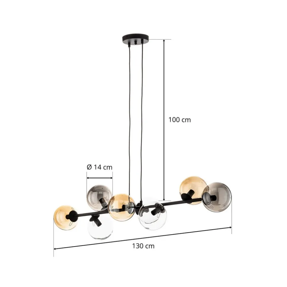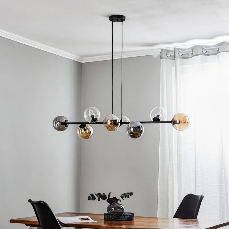 De hanglamp Glassy, 8-lamps, combineert een modern design met hoogwaardige materialen. De lamp is gemaakt van gepoedercoat staal en glas en is verkrijgbaar in de kleuren zwart, grafiet, amber en helder. Deze lamp is niet alleen een optisch hoogtepunt, maar ook functioneel veelzijdig. Dankzij de dimbaarheid via een externe dimmer kan de lichtstemming individueel worden aangepast om verschillende sferen te creëren.