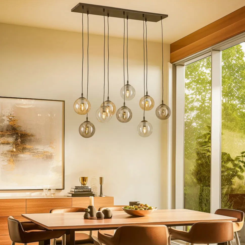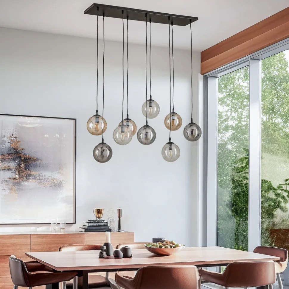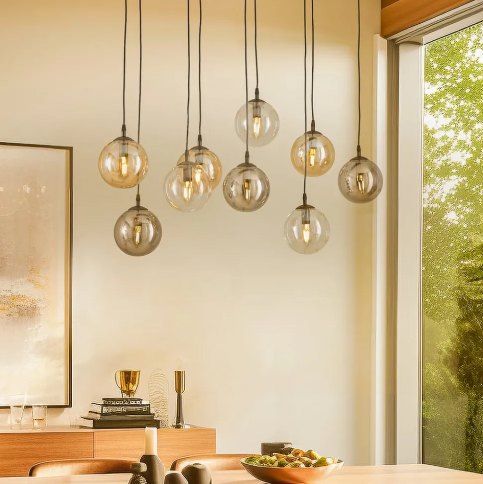 De hanglamp Glassy combineert een modern design met een hoogwaardige afwerking van metaal en glas. Met zijn negen lampen en de stijlvolle combinatie van zwart, grafiet, amber en heldere elementen maakt hij in elke ruimte een indrukwekkende indruk. Deze lamp is niet alleen een optisch hoogtepunt, maar ook vervaardigd in Europa, wat staat voor kwaliteit en vakmanschap.