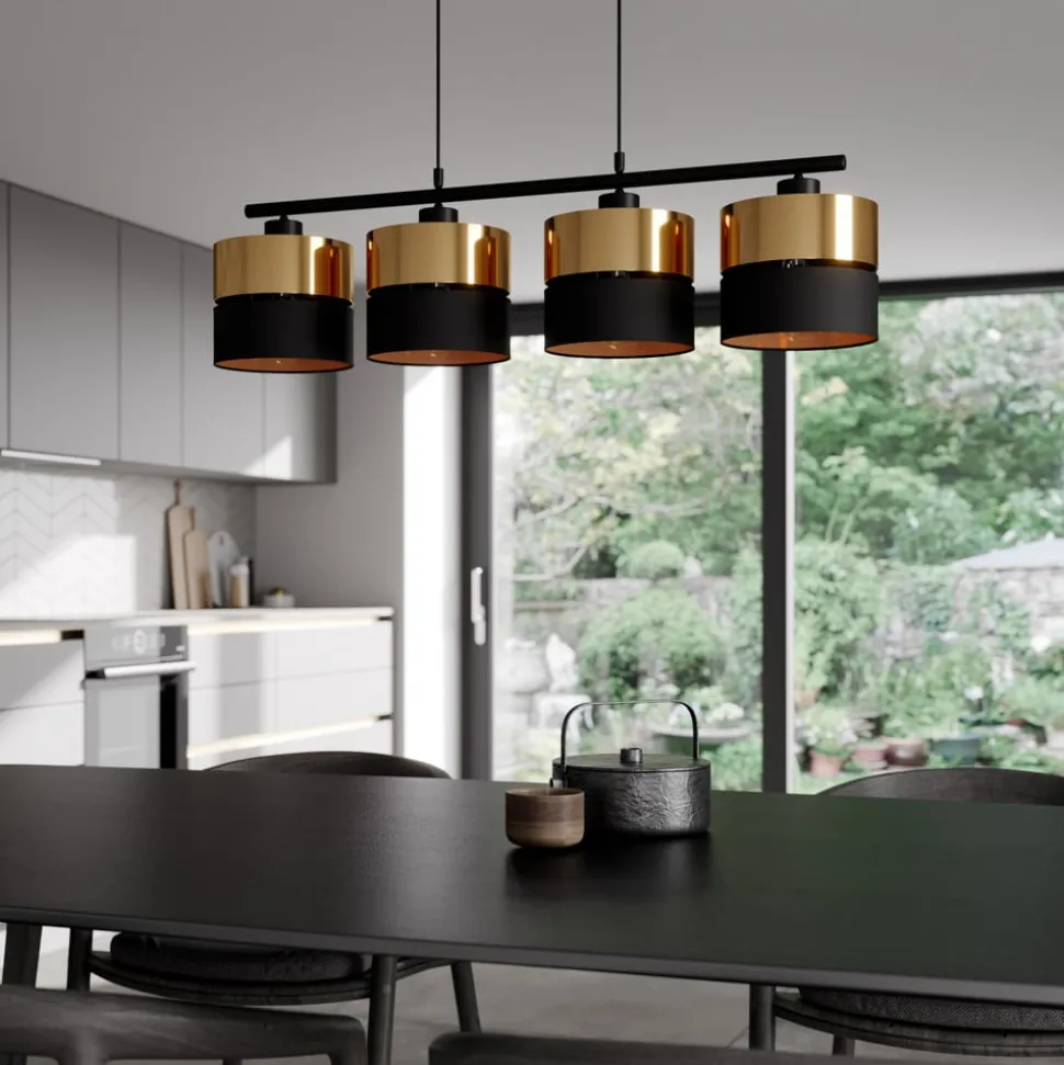 De hanglamp Hilton in zwart en goud combineert modern design met functionele veelzijdigheid. Gemaakt van hoogwaardig textiel en metaal, past hij naadloos in verschillende interieurconcepten en zet hij stijlvolle accenten in de woonkamer, keuken of eetkamer. De 4-lamps constructie zorgt voor een gelijkmatige verlichting en creëert een uitnodigende sfeer.