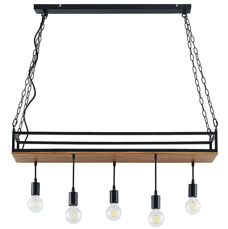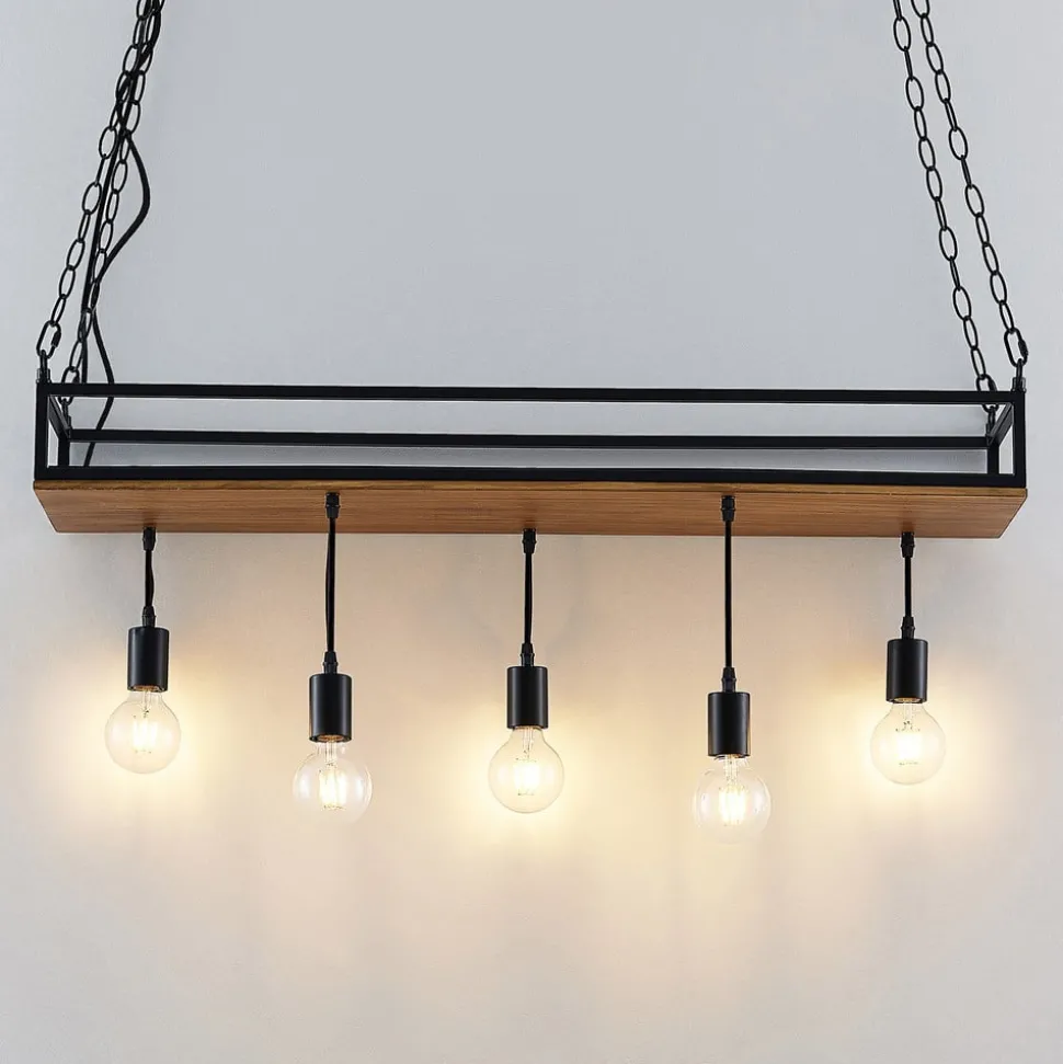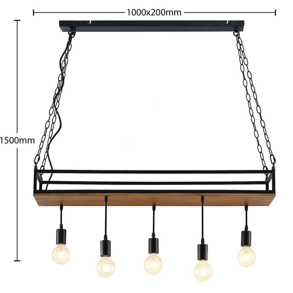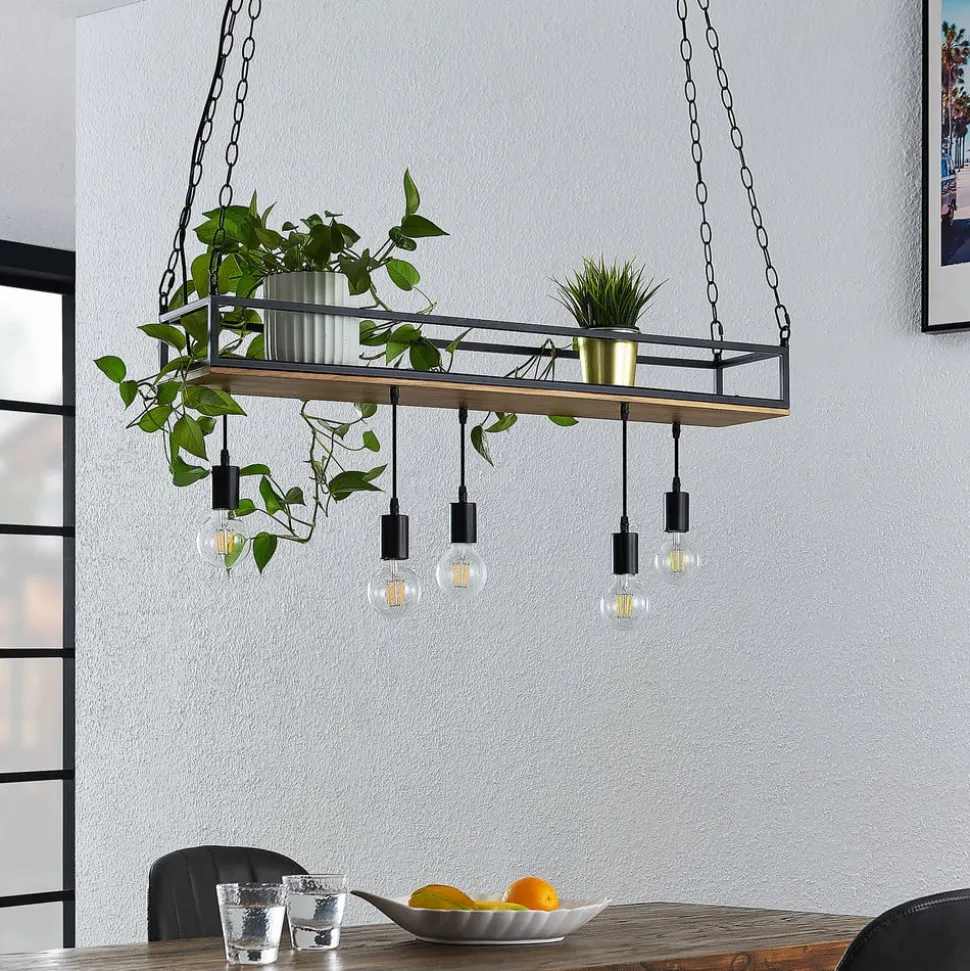 Kirista vijf-lamps hanglamp met donkere houten plaat en zwart ijzeren frame en kettingophanging Deze hanglamp is een mooie highlight voor de keuken en woonkamer en wordt idealiter boven een tafel of aanrecht gemonteerd, waar de vijf lampen voor voldoende helderheid kunnen zorgen om de ruimte te verlichten. De lampen hangen op verschillende hoogtes en bungelen losjes aan het frame, terwijl de houten bovenkant ruimte biedt om er bepaalde voorwerpen op te plaatsen. Dit kunnen meer dan alleen praktische voorwerpen zijn; ook decoratieve objecten kunnen op deze manier vakkundig worden tentoongesteld. Een echte blikvanger is bijvoorbeeld fris groen in de vorm van compacte potplanten, die niet alleen de sfeer in de kamer oppeppen met frisse lucht, maar ook met hun frisse uitstraling. De kettingophanging maakt de vintage look van de zwart metalen hanglamp op een passende manier af en zorgt voor een stabiele houvast. De plank kan met maximaal 15 kilo worden belast.