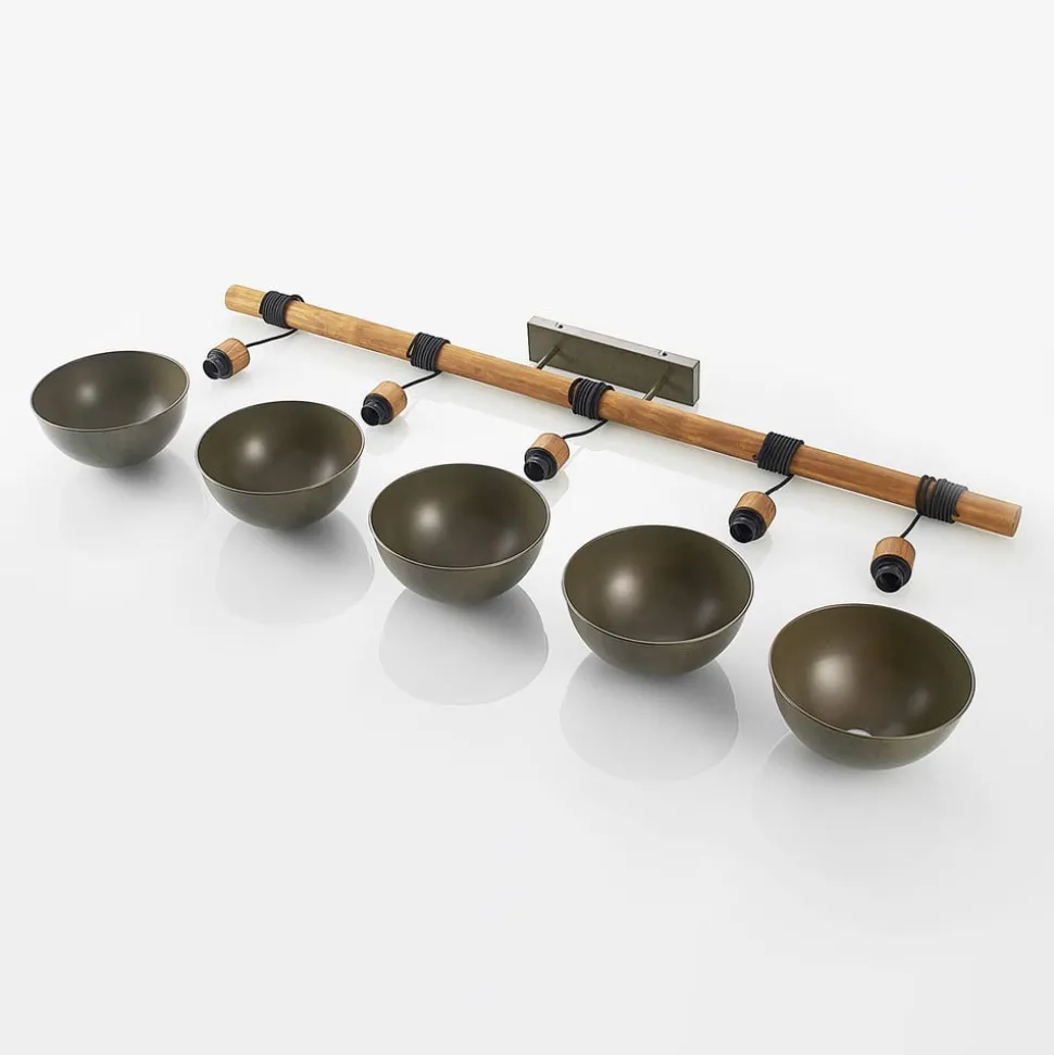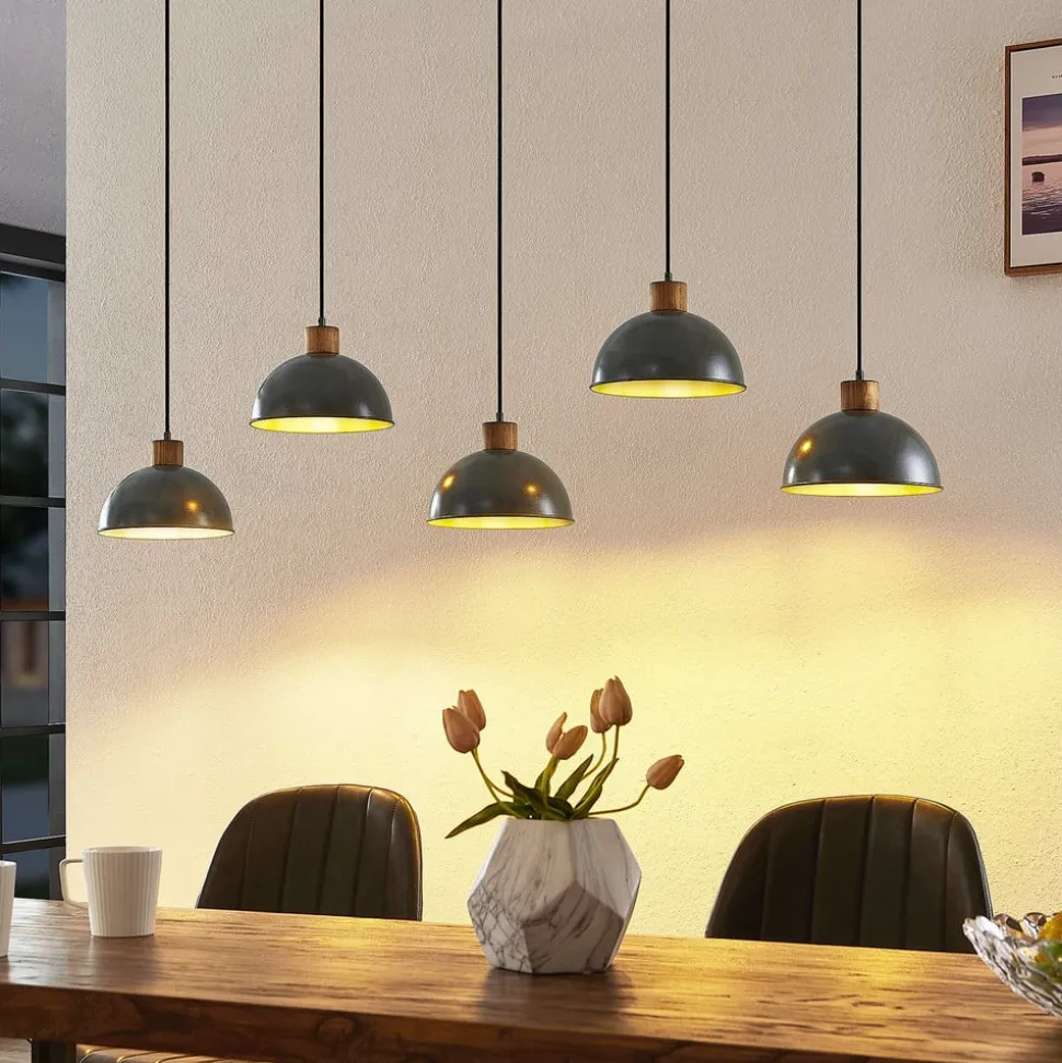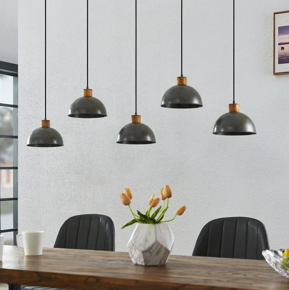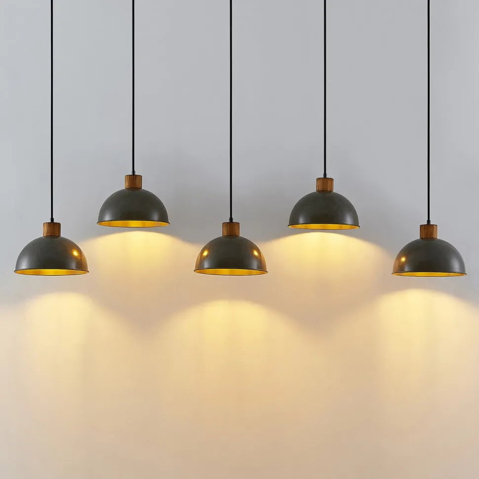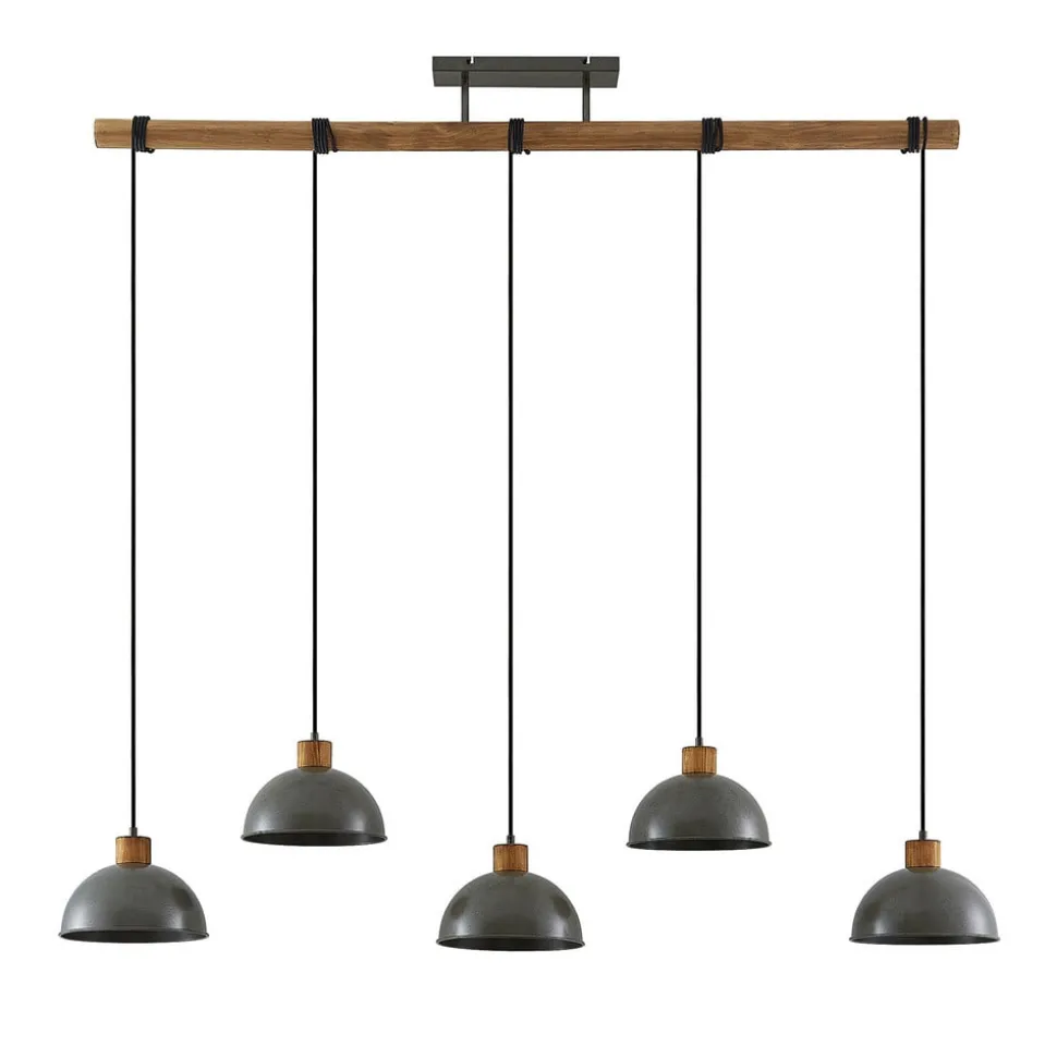 Hanglamp Durbis met vijf handgekleurde metalen kappen De hanglamp Durbis is voorzien van vijf metalen kappen met een handgekleurde afwerking. De afhanghoogte van elke afzonderlijke kap kan worden aangepast door de lange, met textiel bedekte kabel meer of minder vaak rond de dennenhouten kap te lussen. Uitgerust met alle soorten lampen met een E27 lampvoet, is de Durbis hanglamp een effectief, flexibel en veelzijdig armatuur dat bijzonder geschikt is voor het verlichten van een lange tafel.