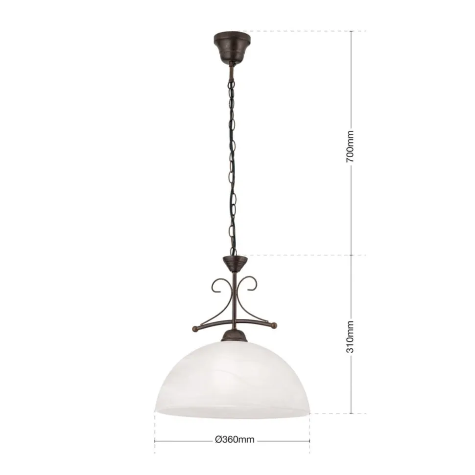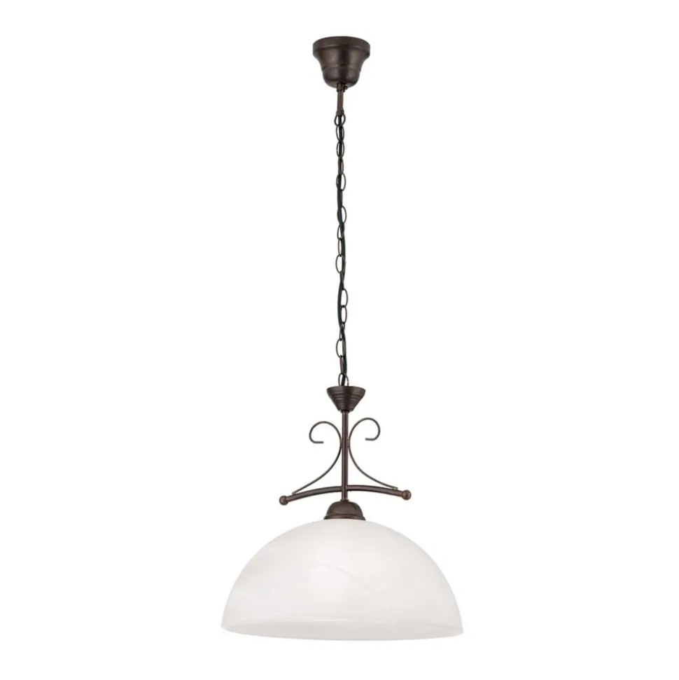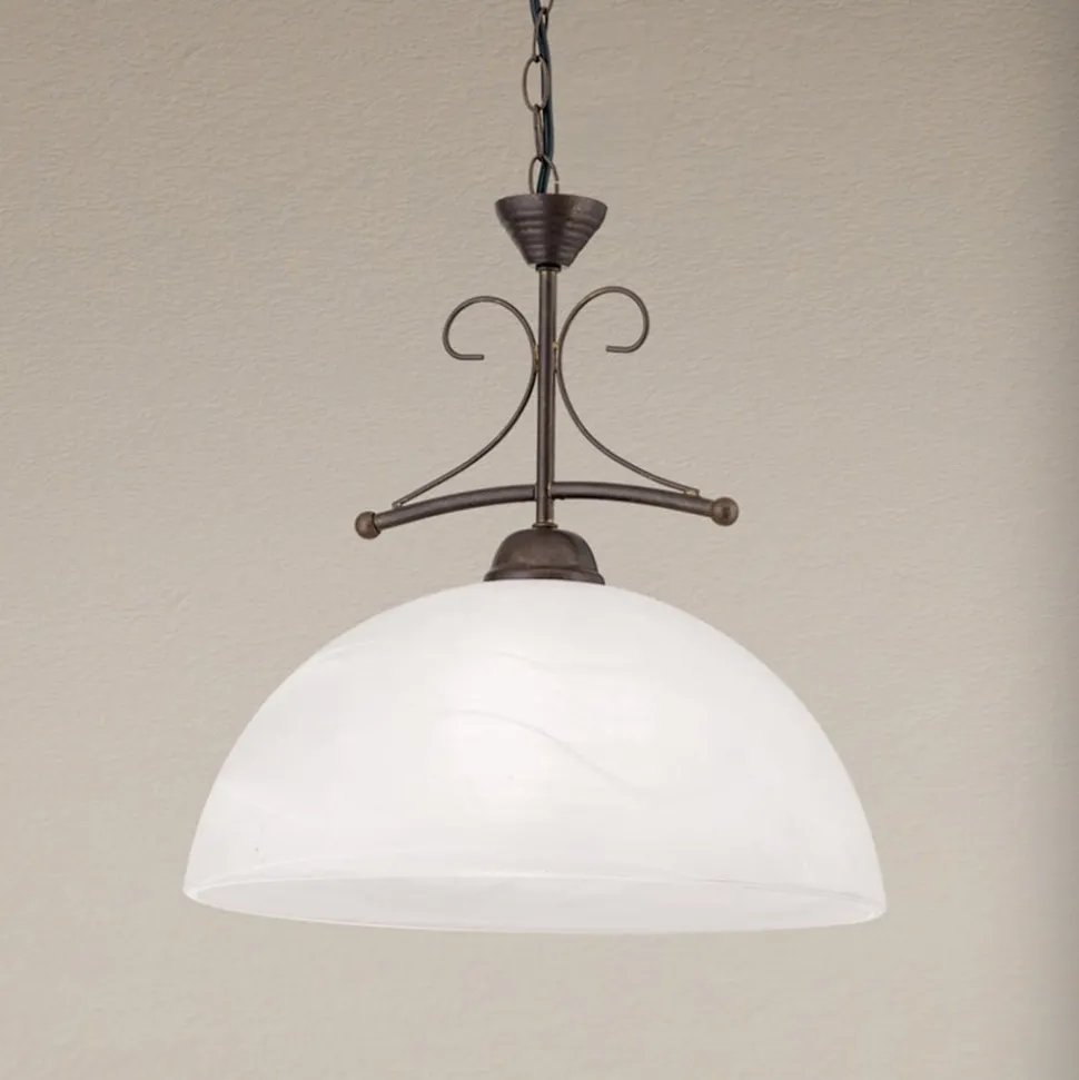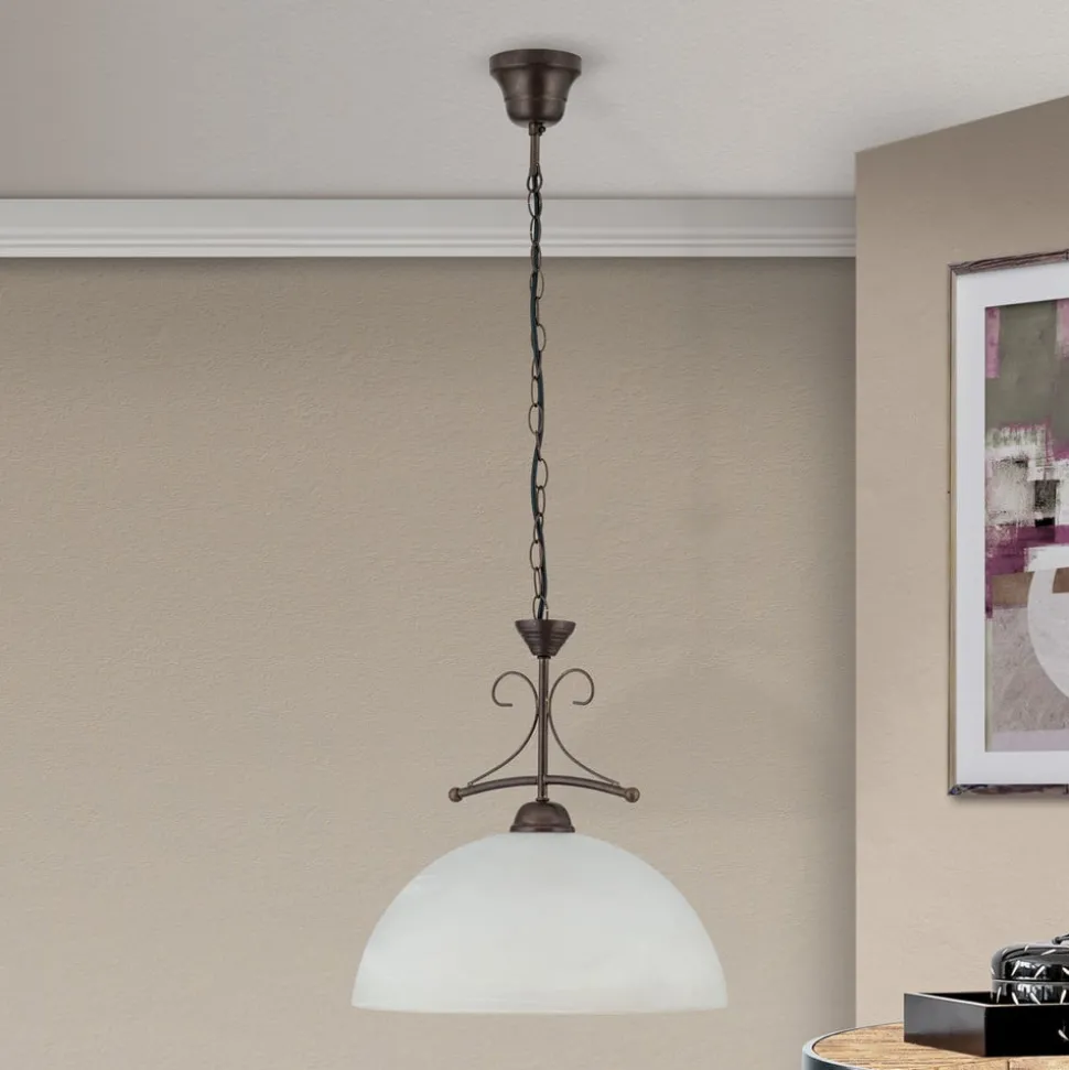 Hanglamp Marco met wit albastglas De hanglamp Marco zorgt voor sfeervolle, rustieke tafel- en ruimteverlichting. De kap van albastglas is open aan de onderkant en wordt vastgehouden door een kunstig gevormde metalen structuur in een antiekbruine afwerking.