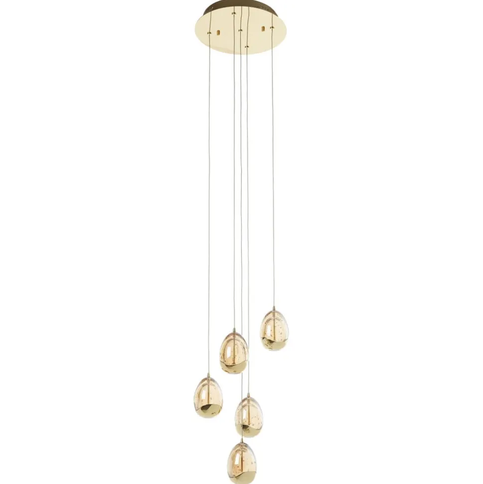 Elegante Rocio LED hanglamp De Rocio LED hanglamp is dankzij haar ontwerp een echte HighLight in elke woonkamer. De glazen kappen, die eruit zien als regendruppels, zorgen voor sprankelend licht dat wordt weerkaatst in de bubbels van de kappen en in kleur breekt. Dat maakt deze hanglamp, die wordt geleverd met vijf kappen, zo bijzonder. Deze speciale versie heeft ook een elegante touch, want de kappen zijn gemaakt van goudkleurig getint glas, wat het licht nog meer warmte geeft.