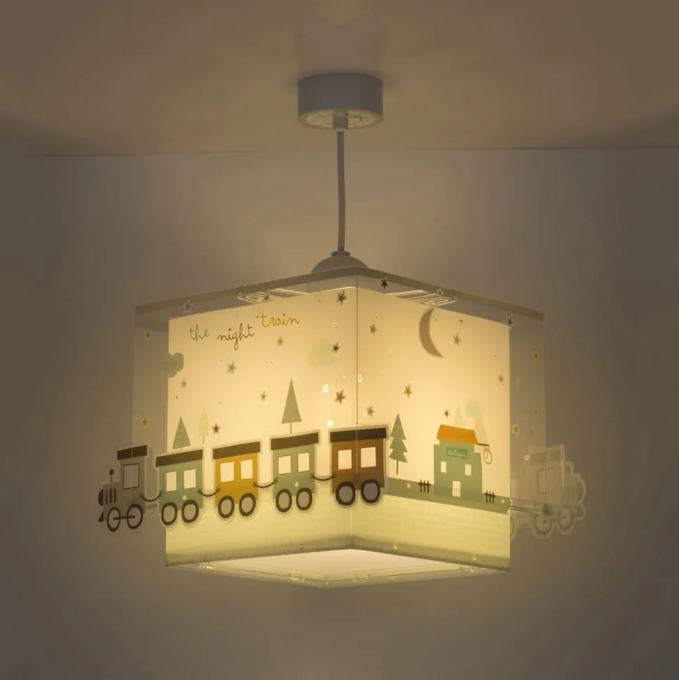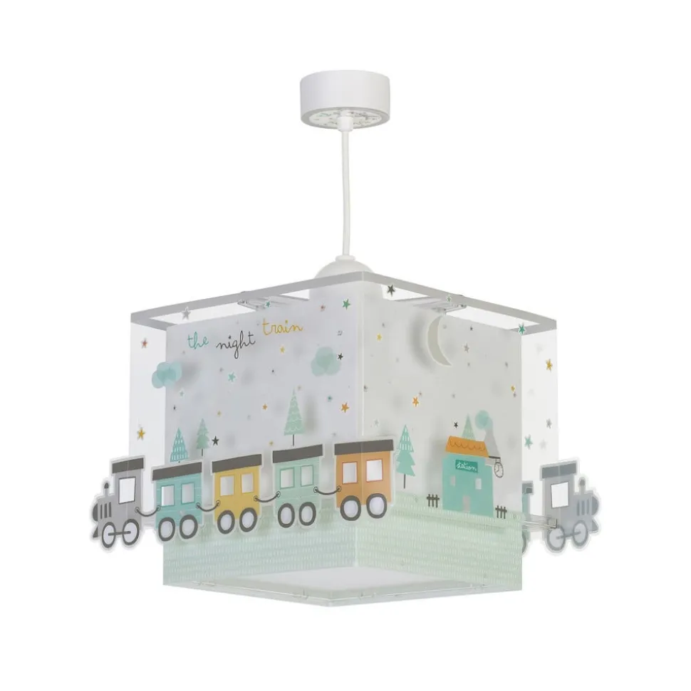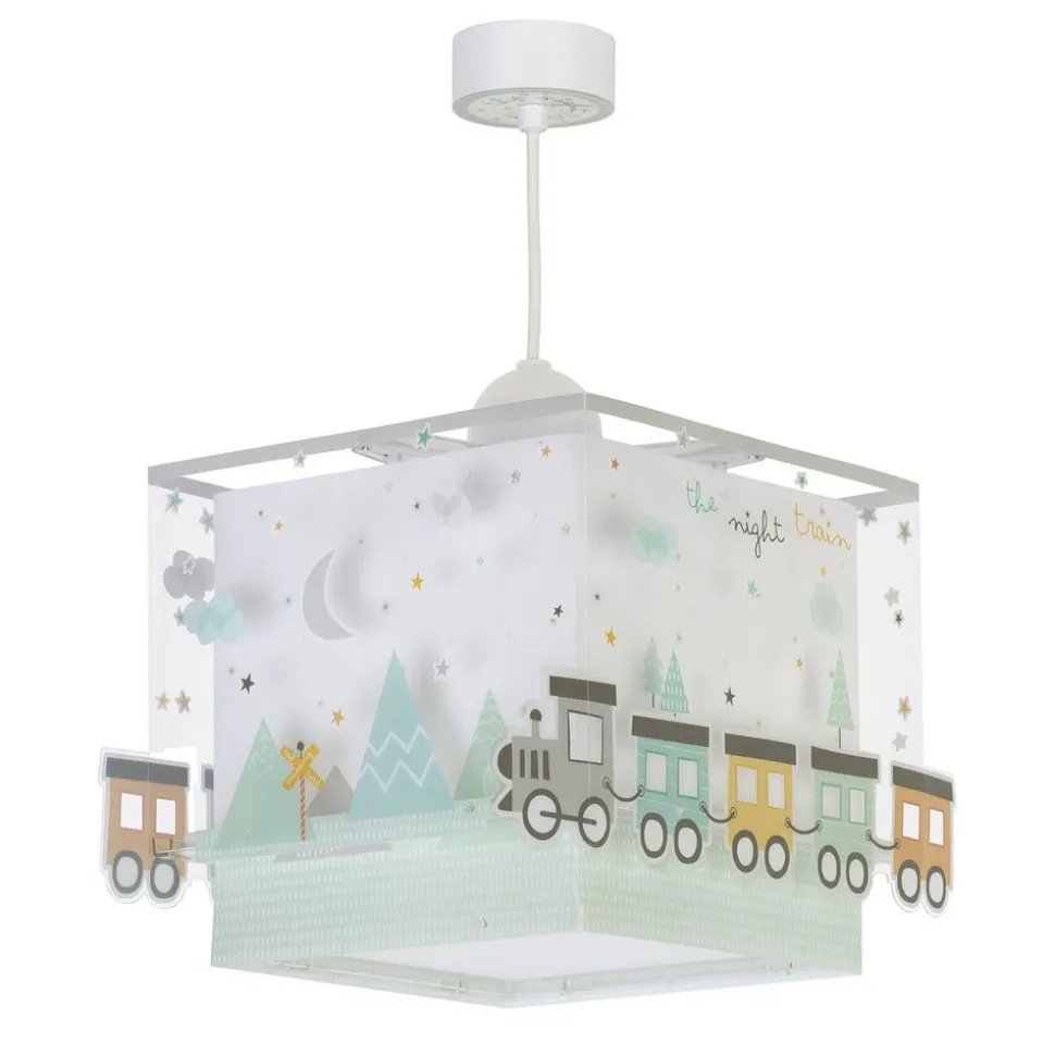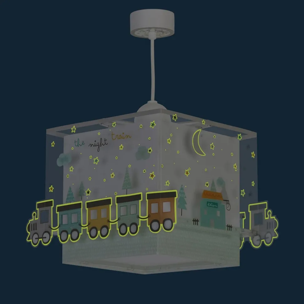 Hoekige hanglamp The Night Train voor de kinderkamer The Night Train hanglamp voor kinderen maakt alleen al indruk door haar mooie uiterlijk. Op de twee kappen staan speelse motieven in subtiele pastelkleuren. De onderste, mat witte kap heeft een doorschijnend oppervlak en is iets kleiner dan de transparante kunststof kap erboven. De kleurrijke Zug, waarop de focus van dit licht ligt, staat een beetje apart van de transparante kap. Het lijkt steeds in een cirkel te rijden. Op de achtergrond zijn motieven zoals bomen, Bergen en Natur de nachtelijke hemel te ontdekken, waardoor de naam perfect bij de lamp past. Dankzij de fluorescerende contouren blijven de Zug en de sterren ook na het uitschakelen van het licht schijnen, als discrete oriëntatiehulp in het donker.