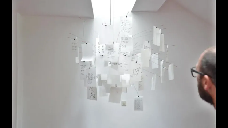Creatieve koppen kunnen zich aan deze design hanglamp Zettel’z 5 echt uitleven. Eigenlijk bestaat Zettel’z alleen uit een spin-achtig roestvrij stalen frame, dat vrij kan worden ontworpen. De talrijke notities blazen hem echter tot leven, die naar wens ook op het frame geklemd kunnen worden. 31 gedrukte en 49 niet-bedrukte DIN A5 labels van hoogwaardig Japans papier zijn meegeleverd en kunnen naar wens aan het frame worden bevestigd. Een totaal van 80 stokjes, waarvan er 40 lang en 40 kort zijn, worden door de centraal geplaatste cilinder gestoken, waaraan de labels uiteindelijk worden vastgeklemd.