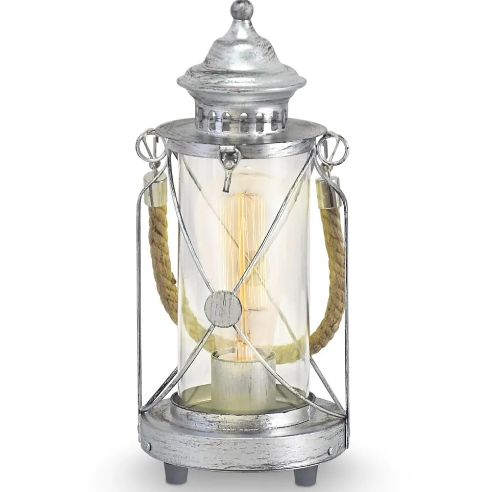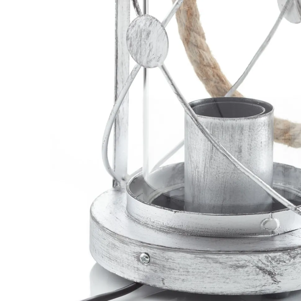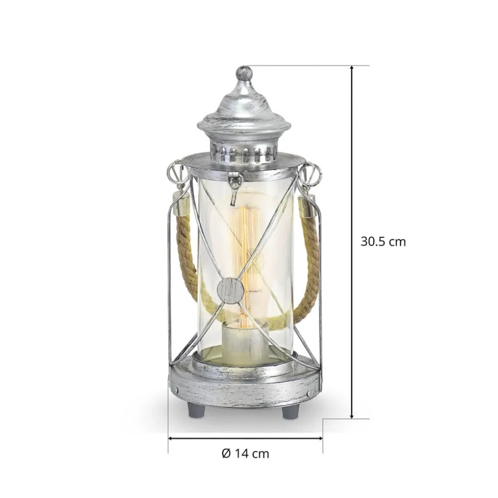 Het ontwerp van de lantaarn-tafellamp Kirian in zilver-antiek leunt aan bij lang vervlogen dagen zonder elektriciteit. De glascilinder wordt omvat door een stalen frame, bovenaan bevindt er zich een ophangkoord. Waar eens kaarsen stonden, zorgt vandaag een elektrische lichtbron, die via snoerschakelaar kan worden bediend, voor een stemmingsvolle sfeer in de kamer. In- of uitgeschakeld – de lantaarn-tafellamp bewijst zich steeds als blikvanger.