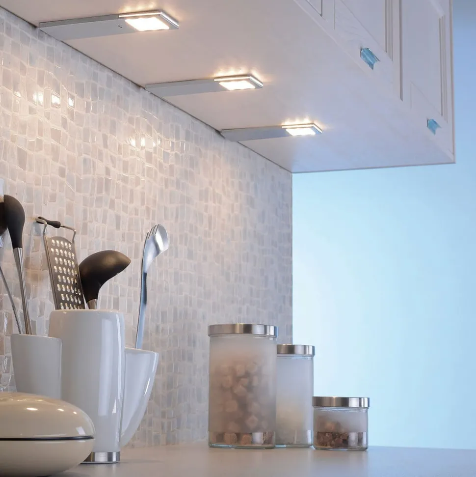 Set van drie platte, rechthoekige Helena LED onderkastverlichting met sensor Helena is een absoluut moderne LED onderkastverlichting waarmee je op veel plaatsen praktische, warmwitte verlichting kunt creëren. Helena komt echt tot haar recht onder bovenkasten boven het werkblad in de keuken. Elk van de drie lampen in de set is uitgerust met een 180 cm lange kabel met aansluitstekker. Alle drie de lampen worden contactloos in- en uitgeschakeld met de sensorschakelaar die in een van de lampen is ingebouwd. De ingebouwde LED’s zorgen voor warmwit licht. Alle drie de lampen worden gevoed via een gemeenschappelijke voedingskabel met plug-in transformator.