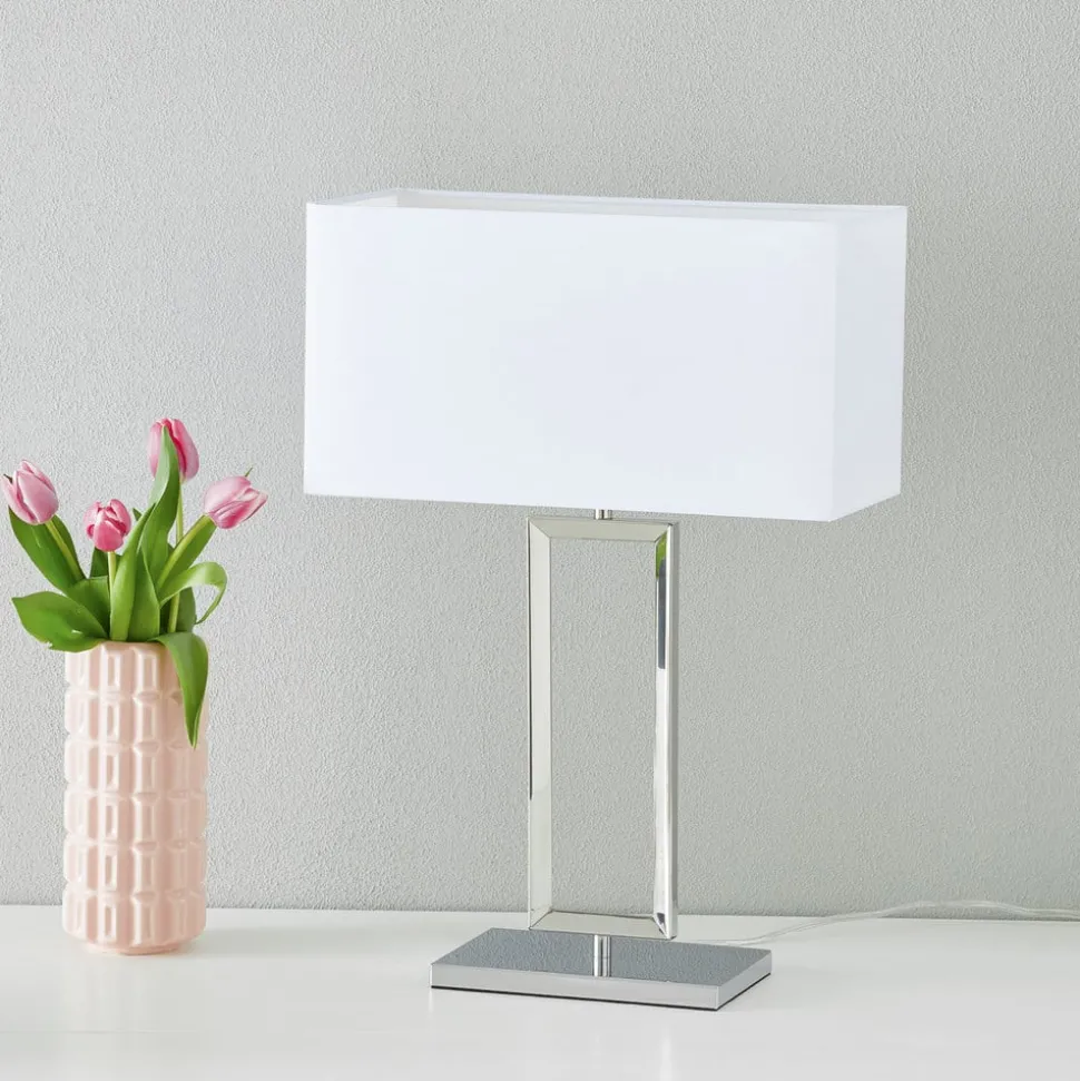 Tafellamp Enna 2 straalt hoekige charme uit Liefhebbers van hoekige vormen komen met deze lamp zeker aan hun trekken. Hier vind je niets ronds. Tafellamp met functionaliteit De lampenkap is bekleed met witte chintz. Deze stof is slijtvast en is ideaal voor lampenkappen vanwege de elegante glans. De voet en voet van de tafellamp zijn gemaakt van glanzend metaal en benadrukken het discrete karakter met hun rechthoekige vormen. In combinatie met moderne meubels vormt deze lamp een harmonieus geheel. Het heldere ontwerp en de materiaalkeuze zijn hier doorslaggevend.