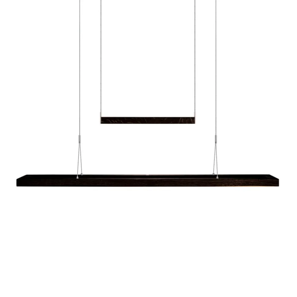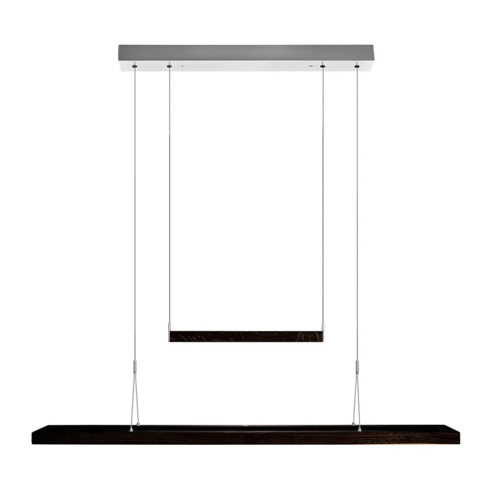 LED-pendelarmatuur Amalia – twee houten pendels, uplight en downlightEen groot, rechthoekig houten frame met naar beneden stralende LED’s en een kleinere houten balk die als contragewicht dient en naar boven stralende LED’s herbergt, kenmerken de LED-pendelarmatuur Amalia met hun natuurlijke uitstraling. De kap van mat geborsteld nikkel zorgt er bovendien voor dat Amalia perfect kan worden gecombineerd met moderne inrichtingsconcepten. Door de ophanging met slanke kabels, contragewicht en in de kap verborgen deflectoren kan de hoogte van de hanger worden aangepast. Afzonderlijke aanraaksensoren voor boven- en onderlicht maken een individuele aanpassing van de lichtsterkte mogelijk- duurzaam geproduceerd hout van FSC-gecertificeerde leveranciers- goede kleurweergave: CRI > 90- dim-to-warm: dimmen verandert de lichtkleur van universeel wit (4.000 K) met hoge lichtopbrengst naar warm wit (2.200 K) met lage lichtopbrengst- vervaardigd in Duitsland