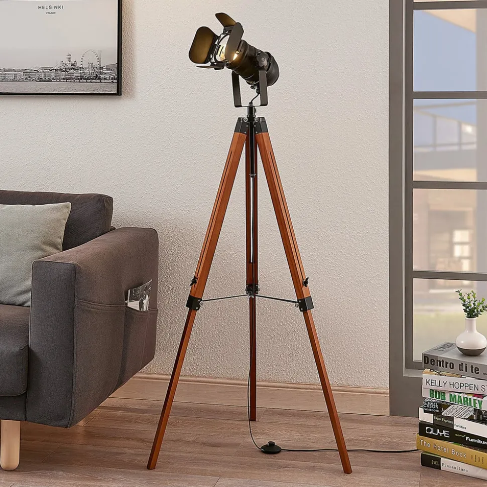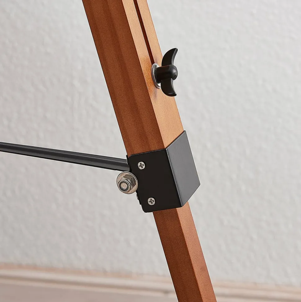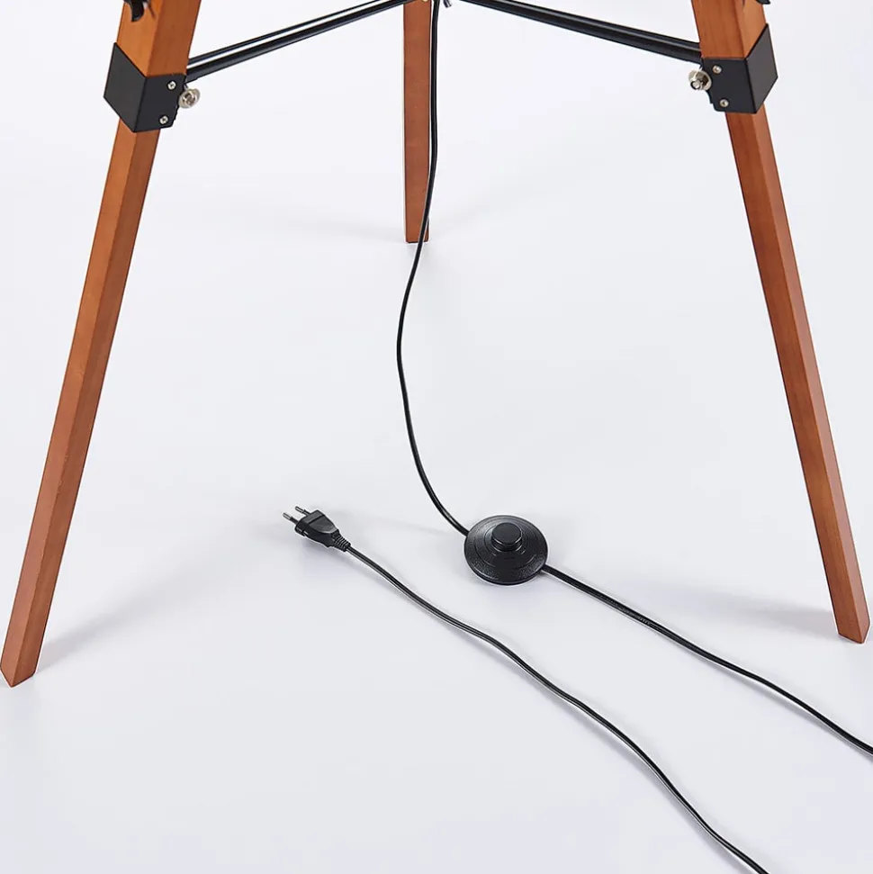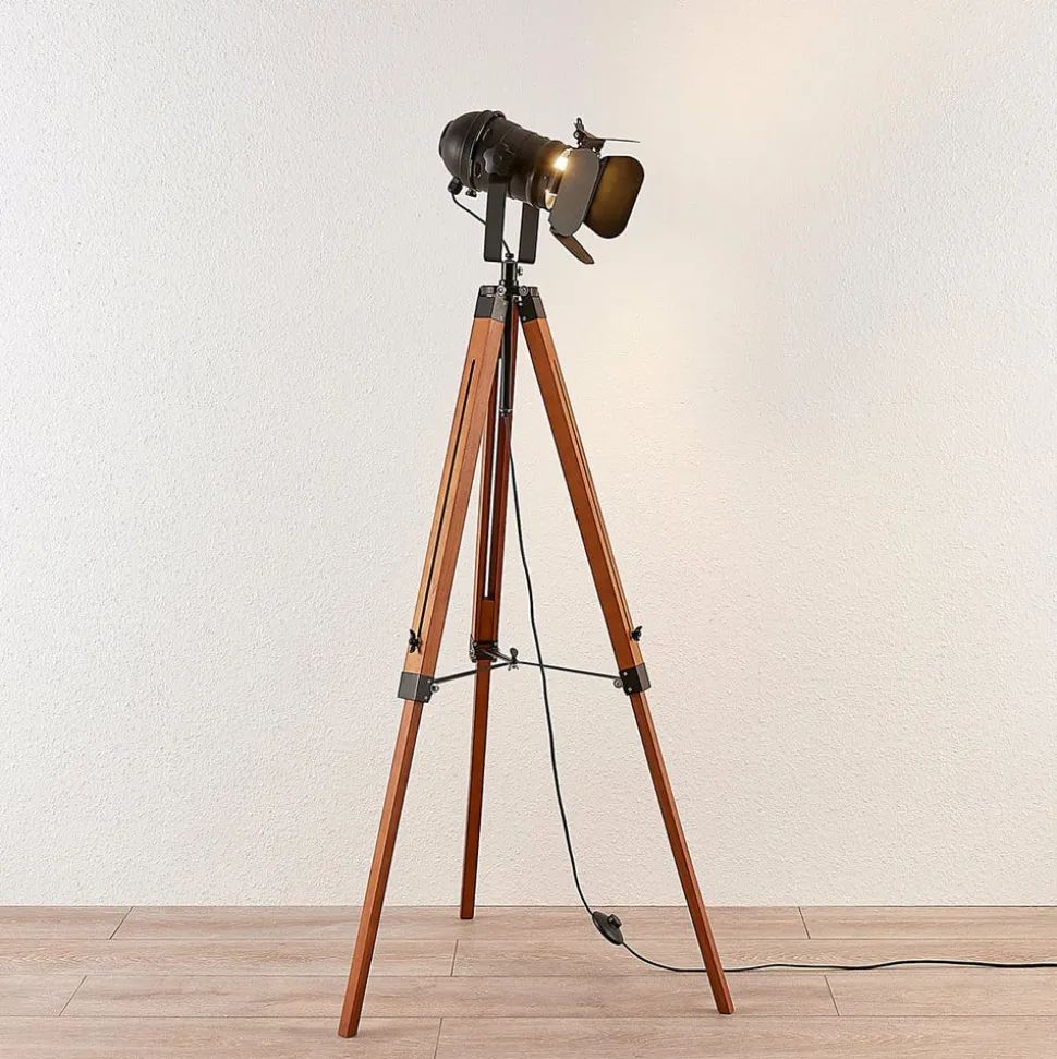 Tripod vloerlamp Hilma met houten frame en kap in klassieke spotvorm