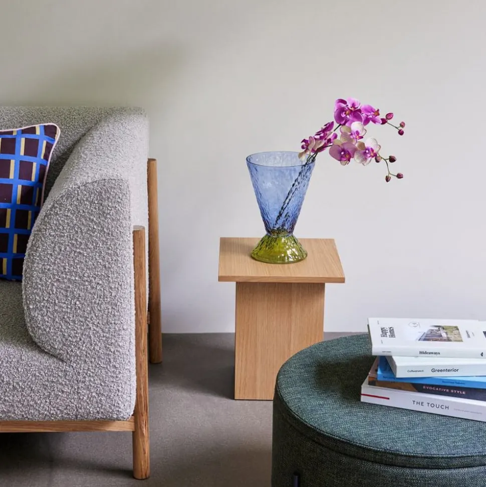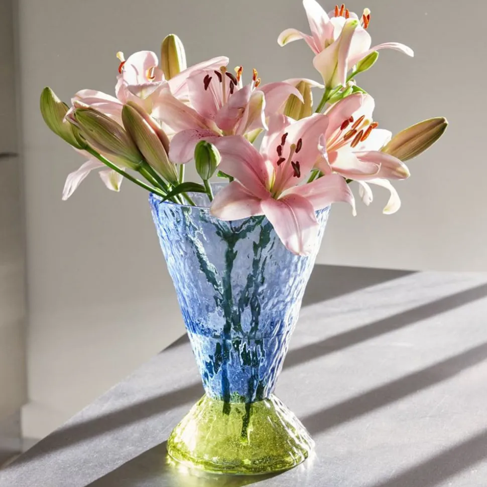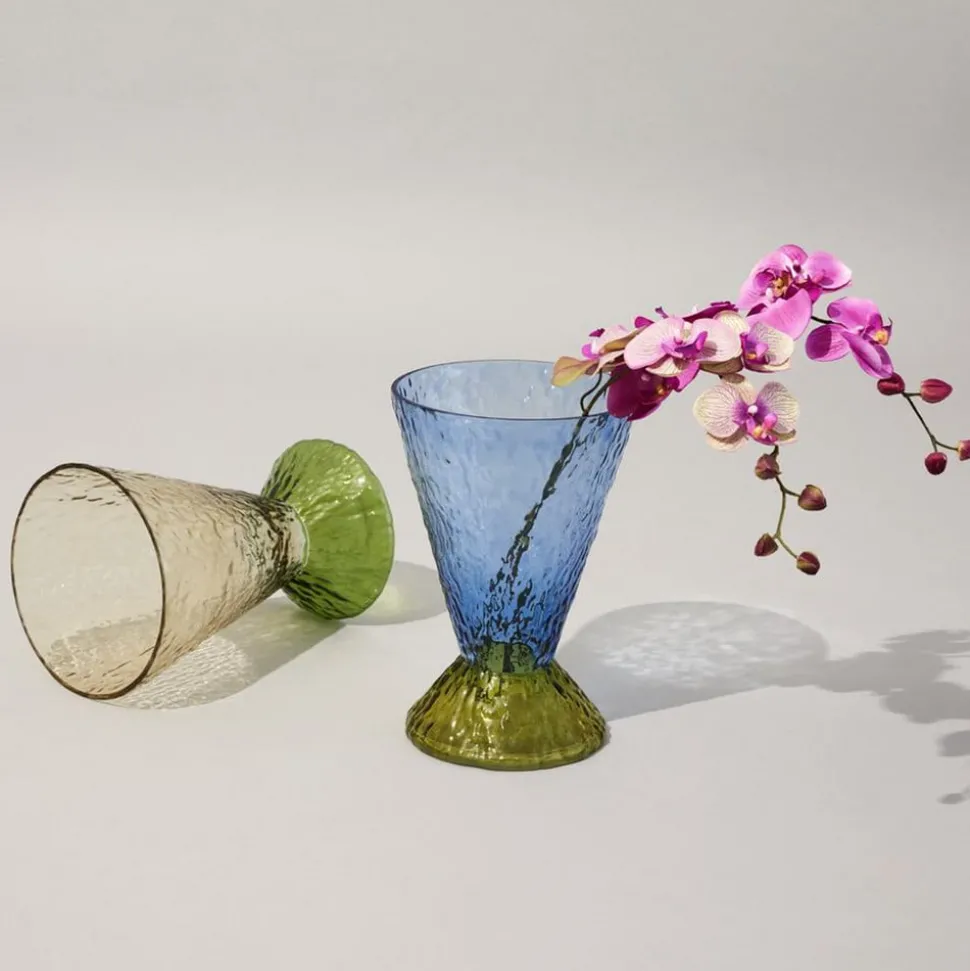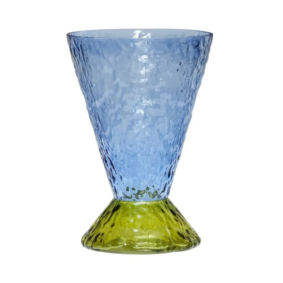 Handgemaakte Abyss vaas van Hübsch Grote decoratieve vaas van lichtblauw en olijfgroen structuurglas. Het is makkelijk om verliefd te worden op de Abyss vaas. Stel je een boeket wilde bloemen voor of een prachtig gerangschikte bos rozen – wat een combinatie!