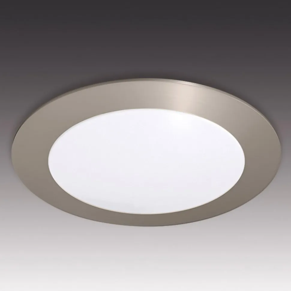 Inbouwarmatuur voor grote oppervlakken FR 68 zonder UV-gehalte De royale diameter van 7,5 cm maakt een heldere en vrij directe verlichting mogelijk. De witte kunststof laat het licht comfortabel doorschijnen. De inbouwarmatuur produceert geen zichtbare lichtpunten, maar verlicht een ruimte in een gezellige warmwitte kleur met 3.000 K en 228 lumen. Dimmen van het licht is in eerste instantie niet mogelijk. Het frame rond het witte glas is ontworpen in de kleur roestvrij staal. Het armatuur heeft een platte vorm.