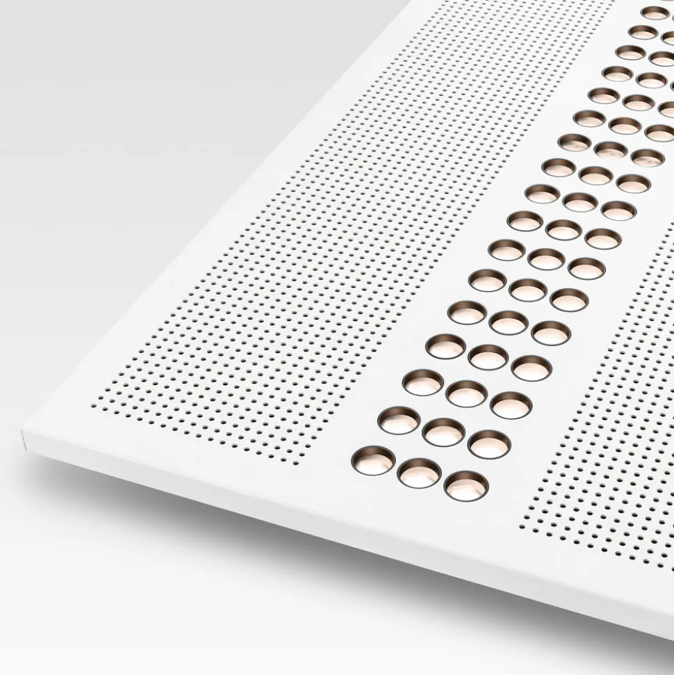 Universele witte taakverlichting op kantoor – Optico LED inlegpaneel voor 62,5 cm x 62,5 cm modulaire plafonds, DALI-dimbaar, geluidsabsorberend Das witte Optico LED paneel is een indrukwekkende functionele lichtbron om in te voegen in modulaire plafonds met een zichtbaar T-profiel. Optico biedt homogeen licht onder een brede hoek (60°) met weinig verblinding (UGR < 16) en kan ook worden gebruikt boven computerwerkplekken. De behuizing is gemaakt van aluminium; de LED's zijn gerangschikt in twee gebieden met micropoint optiek. Als bijzonder kenmerk reduceert de akoestische armatuur met zijn geluidsabsorberende oppervlak het invallend geluid met 50% en creëert zo een aangename akoestiek in de ruimte. – met Dali dimbare Konverter – klaar voor netaansluiting – thermisch management met vormgeïntegreerde passieve koeling – geen UV- of warmtestraling – winnaar van de German Design Award 2019
