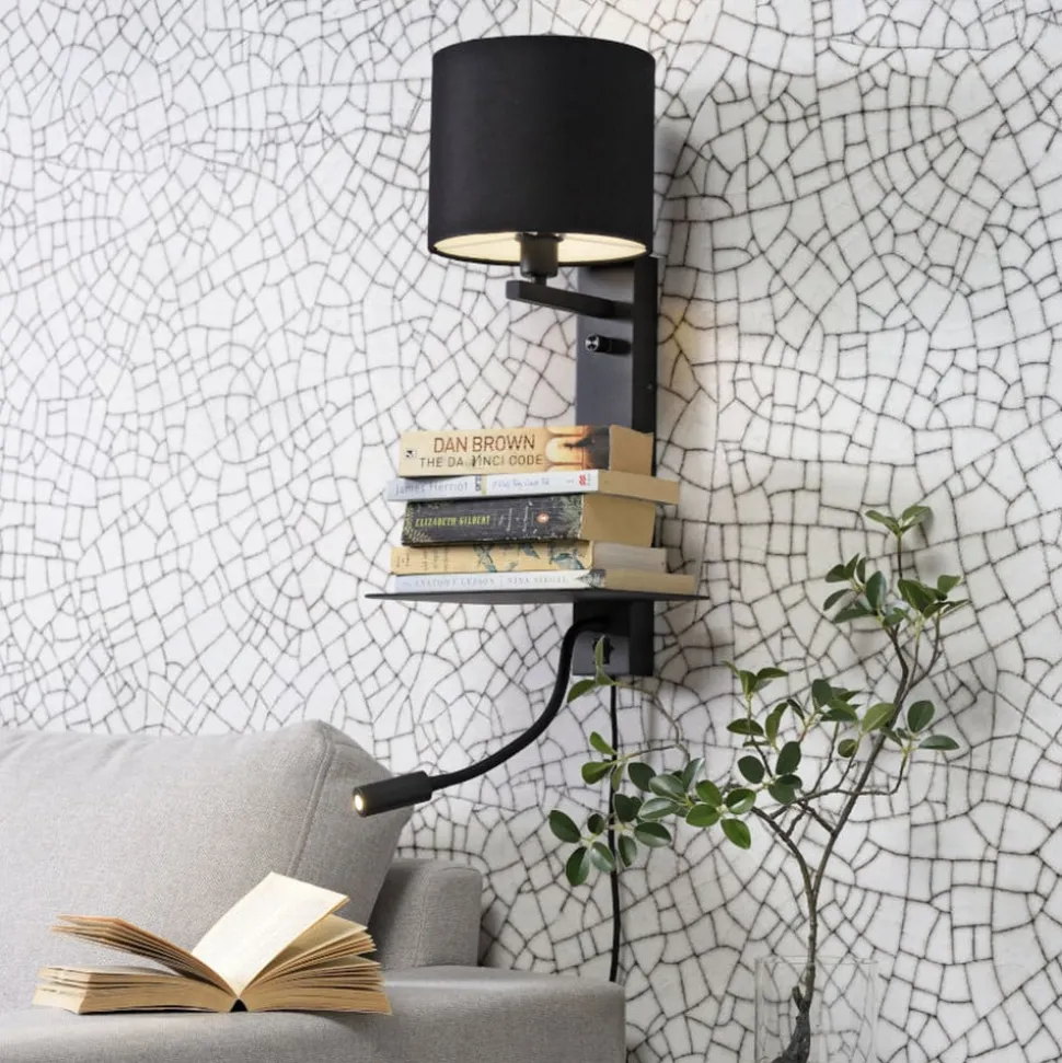 Wandlamp Florence met praktisch schap en extra leeslamp op de flexarmDe wandlamp Florence combineert veel praktische functies waardoor ze ideaal is als avondverlichting naast het bed. Hij heeft een plank die ook is uitgerust met een USB-poort. Je kunt dus comfortabel boeken of je smartphone neerzetten en tegelijkertijd opladen. Verder is er een dimschakelaar geïntegreerd, waarmee je de wandlamp niet alleen moeiteloos aan en uit kunt zetten, maar ook kunt dimmen. De kap van textiel zorgt voor een zeer diffuus, aangenaam licht. Wie behoefte heeft aan gerichte, punctuele verlichting zal enthousiast zijn dankzij de kleine LED-spot op de flexibele arm.Bijzonderheden van It’s about RoMi:- sinds 2010 gebruik van duurzame materialen- voor elk verkocht armatuur wordt een boom geplant- dit compenseert de CO2-uitstoot- sinds 2019 samenwerking met Eden Reforestation Projects- elk armatuur is geïnspireerd op een stad