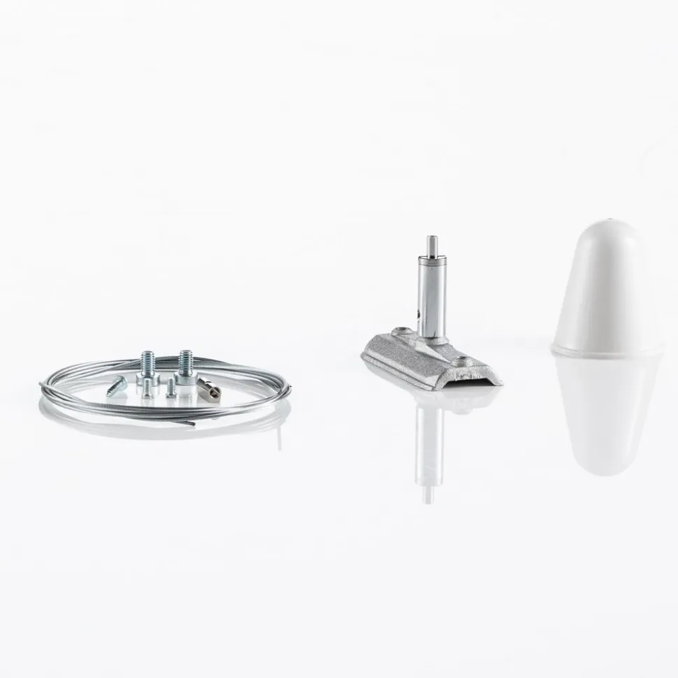 Met dit accessoire kunnen Ivela LKM 3-fasen railsystemen worden opgehangen. Inclusief 2 m staalkabel, baldakijn, kabelspanner en 6 cm lange bevestigingsplaat voor de rail.