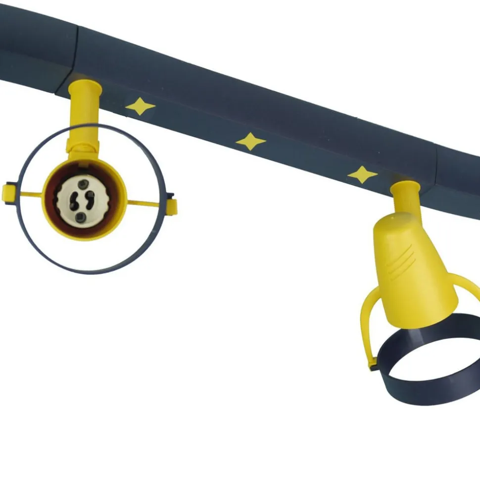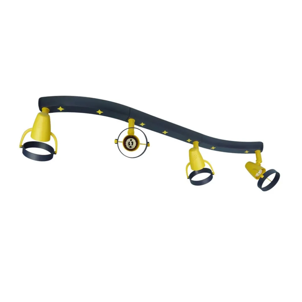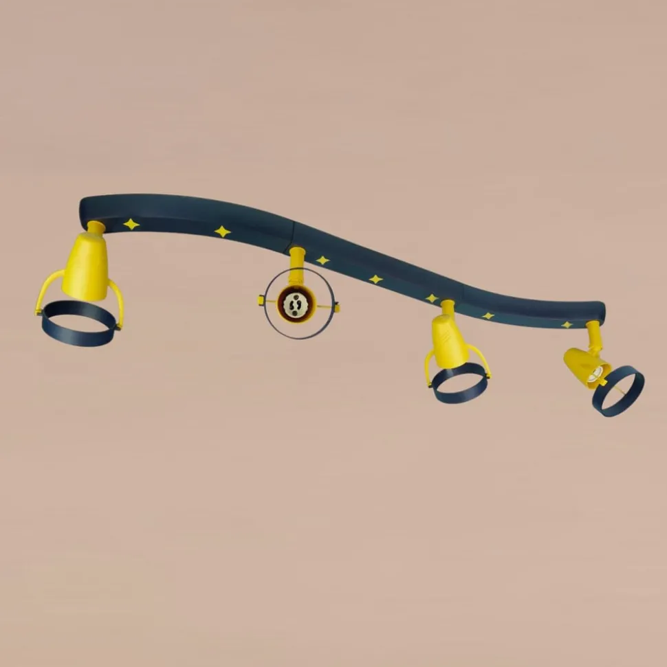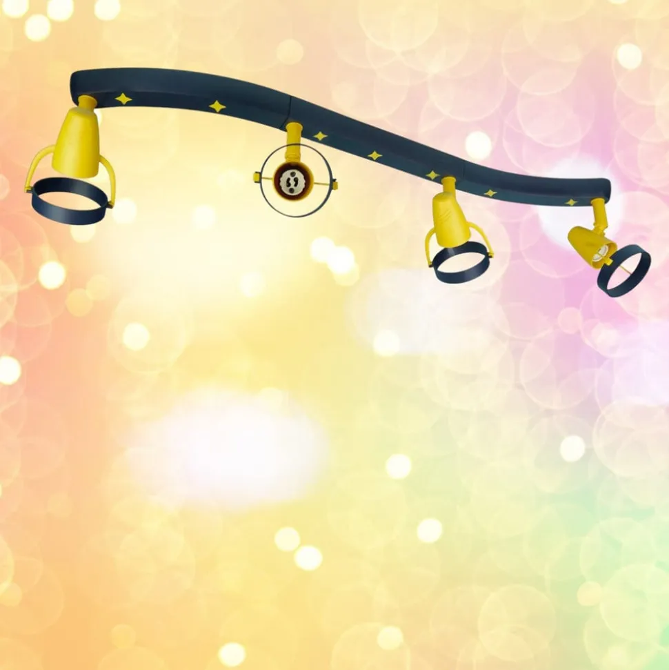 4-lamps plafondspot Joan met sterrendecor Joan is een geschikte plafondspot voor de kinderkamer met verstelbare lampenkoppen en heldere verlichting. De licht gebogen plafondbalk is blauw geschilderd en heeft een prachtig geel decor met sterren.