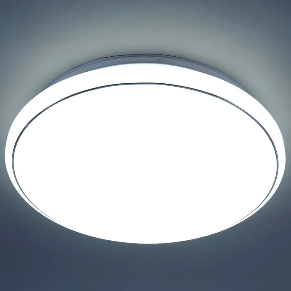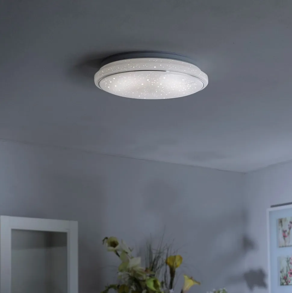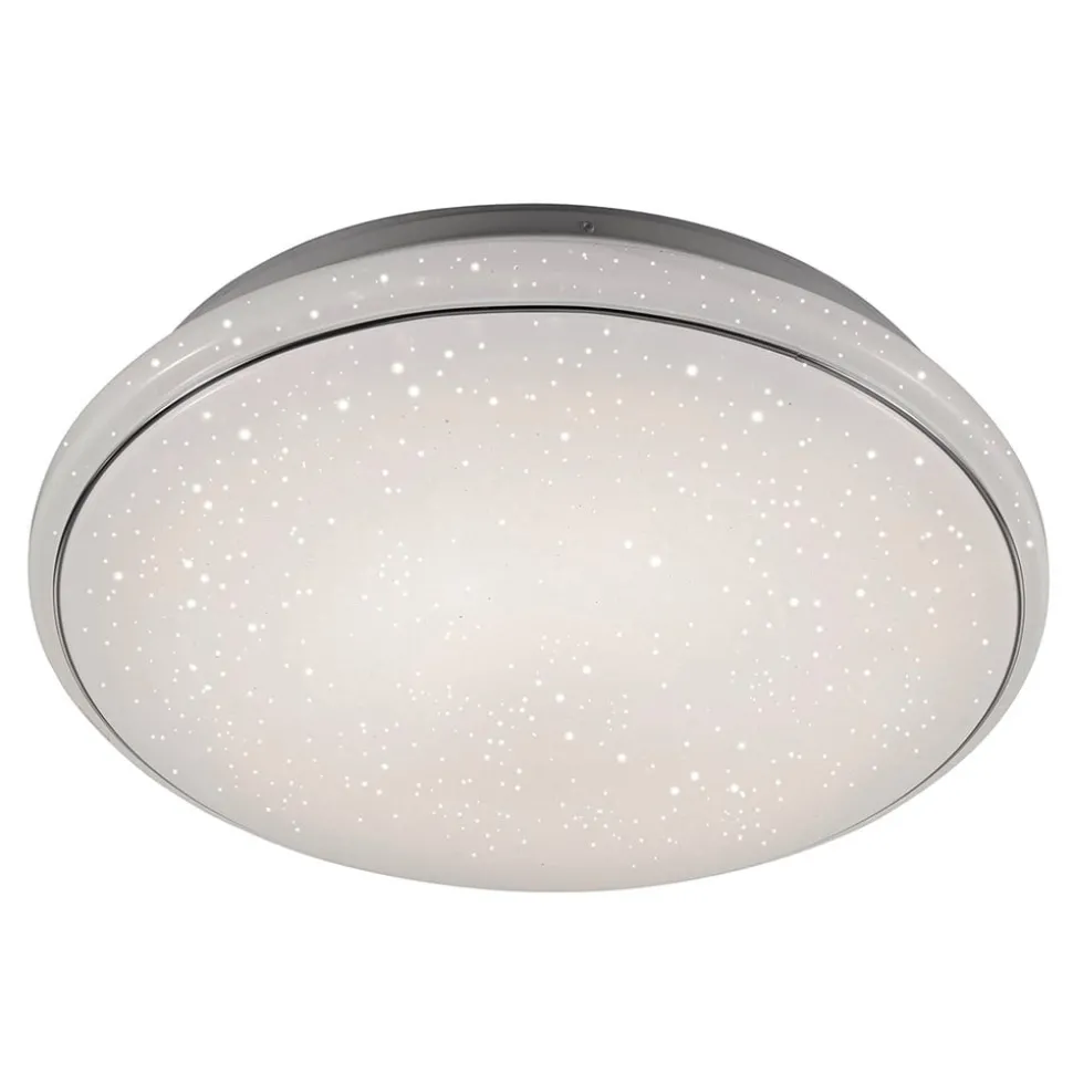 De vrij grote Jupiter LED-plafondlamp is gemaakt van staal en kunststof en heeft een diameter van 60 cm. De gesatineerde kap is bewerkt met ontelbare kleine, doorschijnende punten waardoor het licht ongehinderd doorschijnt en de hele kap er als een unieke sterrenhemel uitziet. Een ander hoogtepunt van de LED-plafondlamp Jupiter is dat men in tegenstelling tot sommige andere LED-lampen niet hoeft te kiezen voor een lichtkleur. Door de uitrusting van CCT-techniek is het mogelijk om naar behoefte tussen de lichtkleuren warmwit (3.000 K), universeelwit (4.000 K) en daglicht (5.000 K) te kiezen – heel eenvoudig door een meegeleverde afstandsbediening. Hiermee kan niet alleen de gewenste lichtkleur worden uitgekozen, maar kan bovendien ook elke gekozen lichtkleur in fasen worden gedimd.