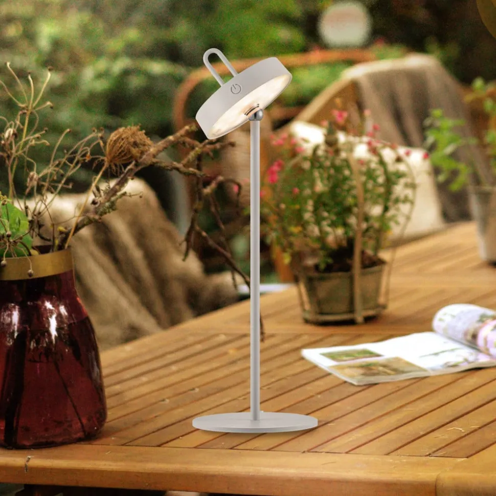 Amag mobiele LED tafellamp met verstelbare kop De Amag LED tafellamp van metaal is een moderne en flexibele extra lichtbron. De ronde kop kan dankzij een kogelgewricht rondom worden gekanteld. De geïntegreerde LED spot schijnt naar beneden en wordt geschakeld en gedimd met de knop aan de zijkant van de kop. Uitgerust met een oplaadbare batterij kan Amag zonder stroomaansluiting worden gebruikt en is dankzij de spatbescherming ook de ideale HighLight voor tuin en terras – Beschermingsgraad: IP44 – Oplaadtijd: 4 uur – Brandduur bij hoge lichtsterkte: 7 uur