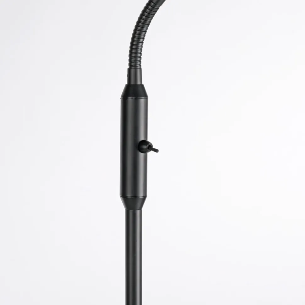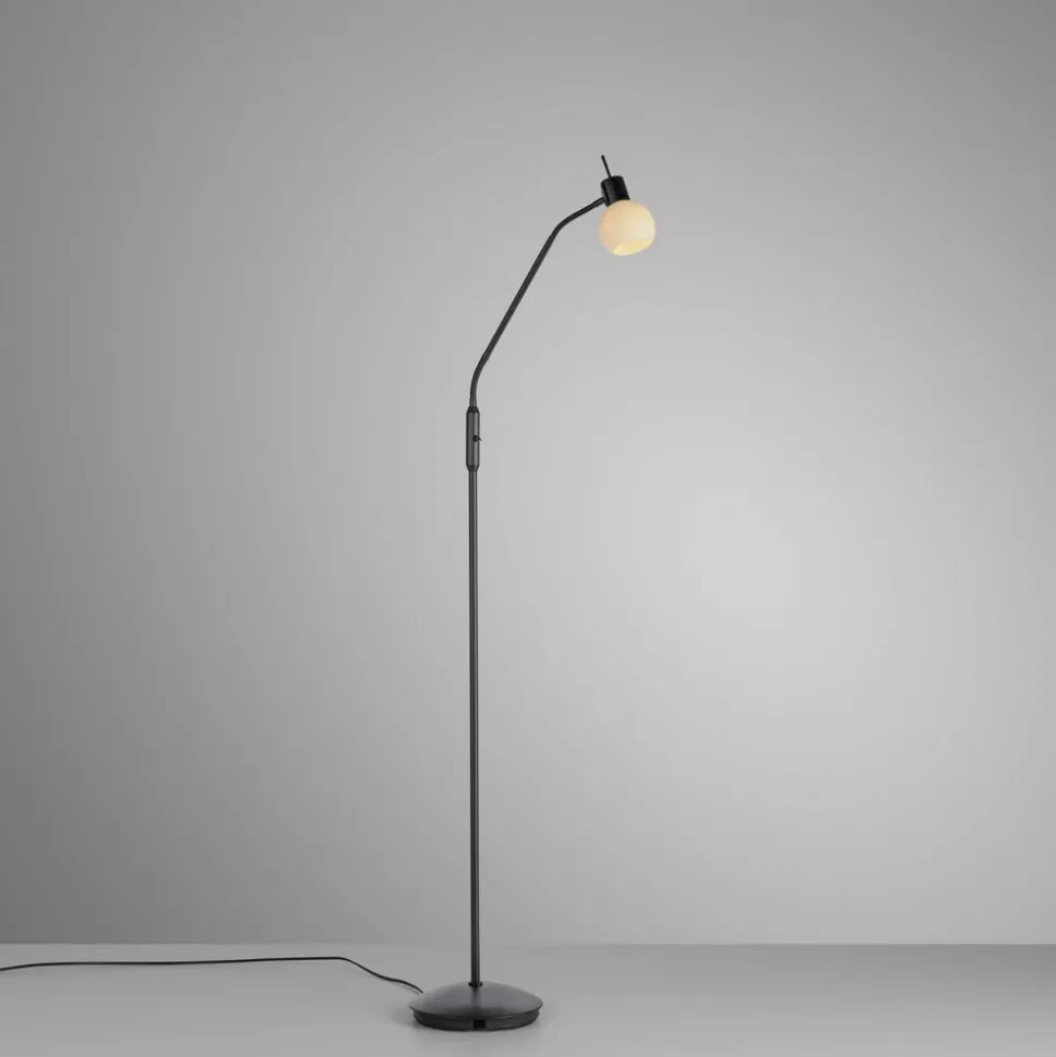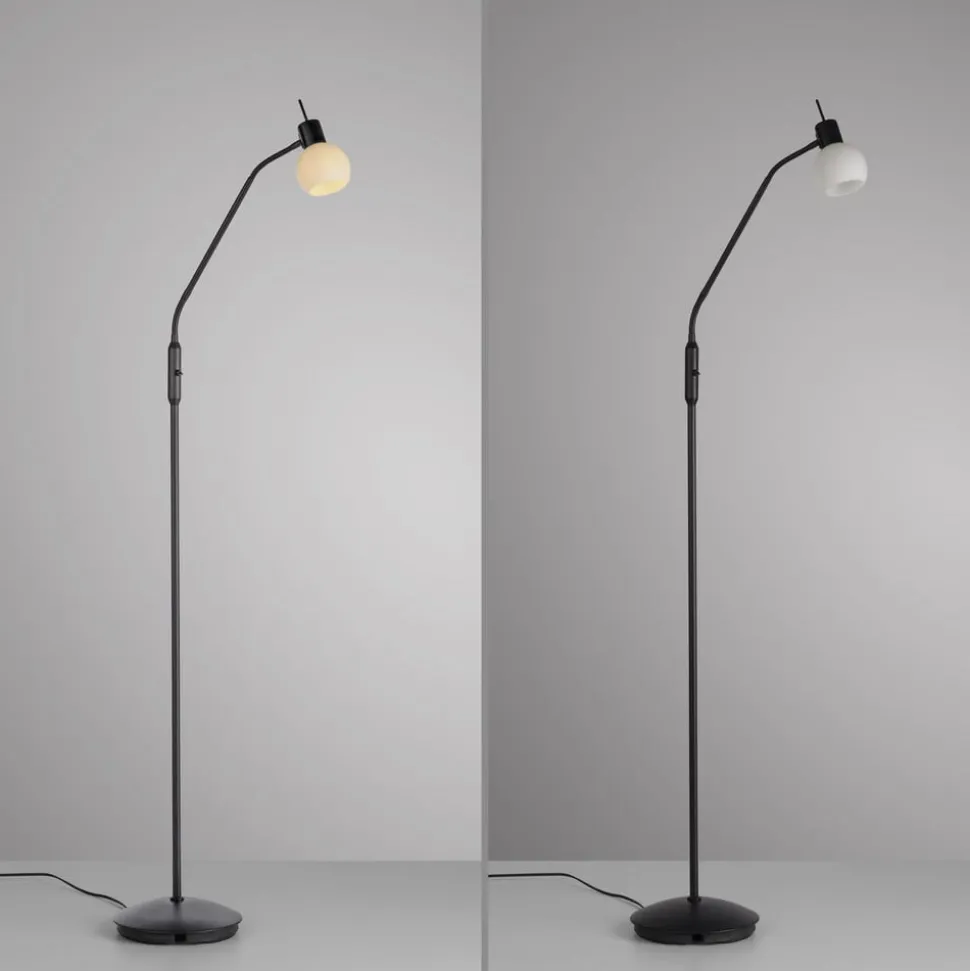 Tafellamp Loki van ijzer en glas met E14 LED lamp Loki is een slanke vloerlamp met een zwart gelakt ijzeren frame en een bijna bolvormige glazen kap. Hij is perfect als leeslamp in de woonkamer en kan naar wens worden gericht dankzij de twee flexibele secties in het bovenste derde deel van het frame. De sierlijke vloerlamp met een bijna bolvormige, gesatineerde kap wordt geleverd met een LED lamp met E14 lampvoet en warmwitte lichtkleur en is voorzien van een schakelaar op het frame.