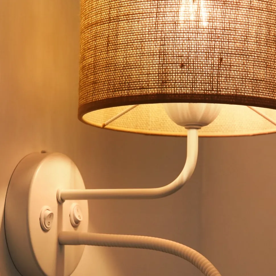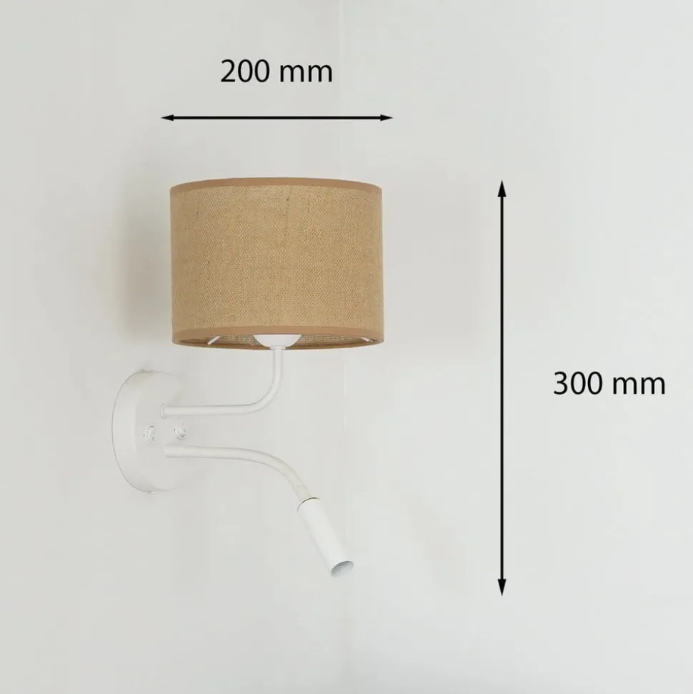 Jute wandlamp, bruin/wit, stof, leeslampje