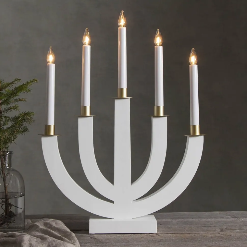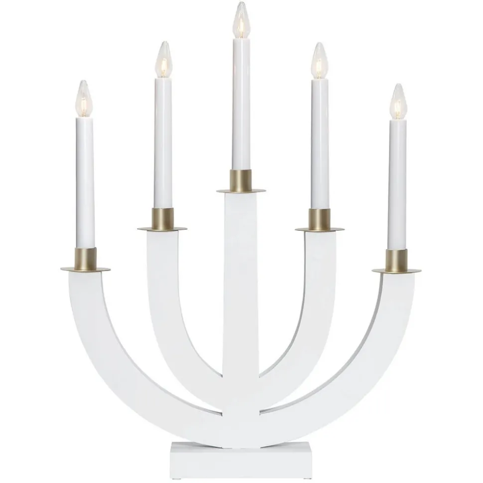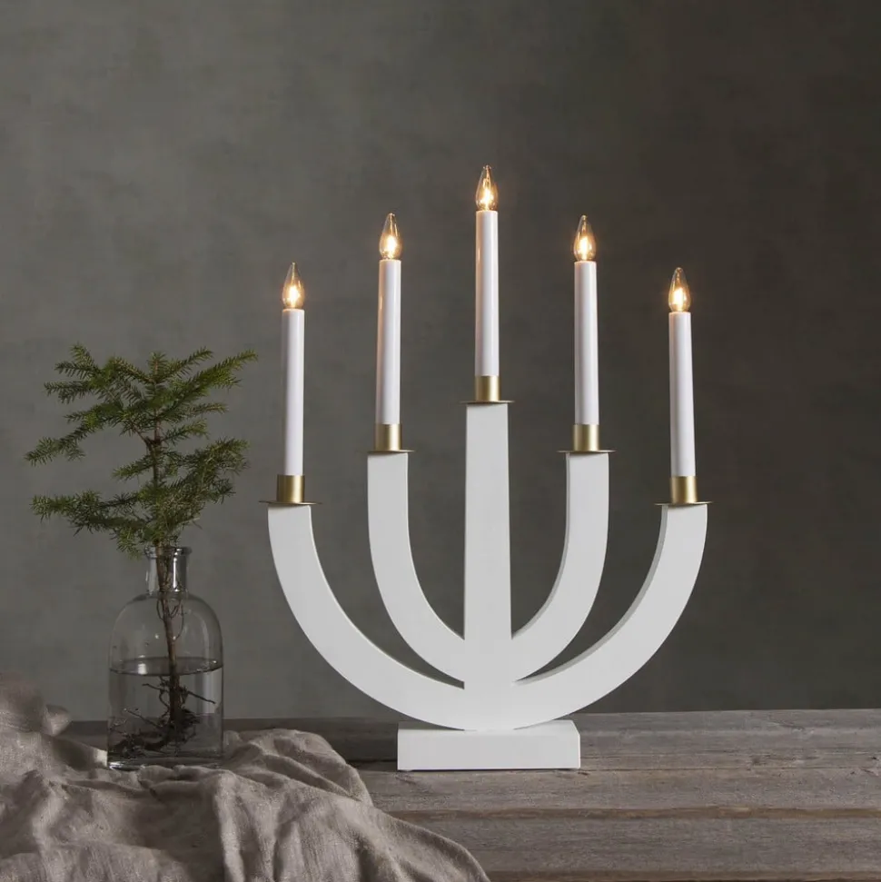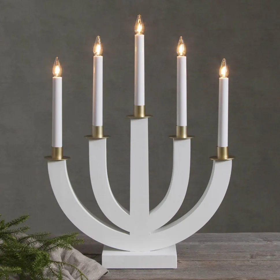 Vijfarmige kandelaar Eli in wit en goud Exclusief ontwerp met een golvende vorm kenmerkt de Eli kandelaar. Eli is gemaakt van wit gelakt hout en de kandelaars zijn gemaakt van metaal met een goudkleurige afwerking. Eli is ideaal voor stijlvolle kerstdecoraties en ziet er net zo opvallend uit voor een raam als als sfeervolle accentverlichting op bijvoorbeeld een salontafel. Die lampen zijn al bij de levering inbegrepen. Vervangende lampjes zijn ook inbegrepen. Voorzien van een schakelaar op het snoer.