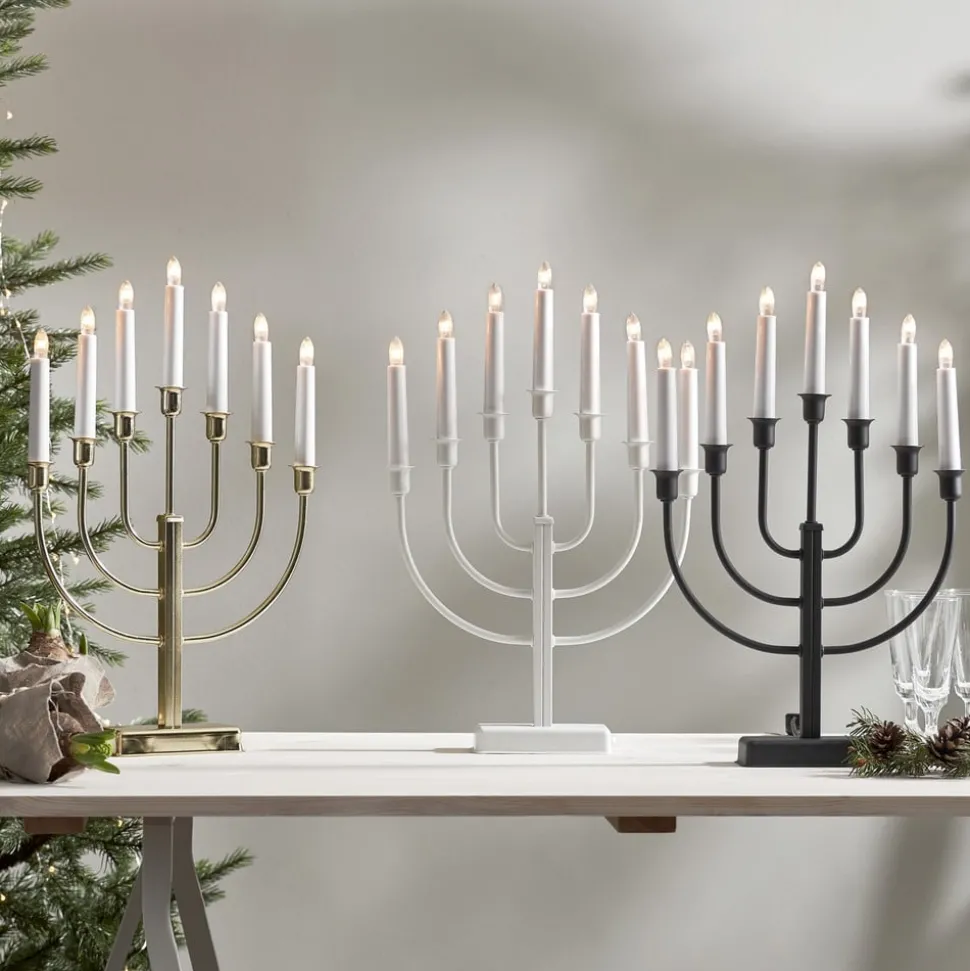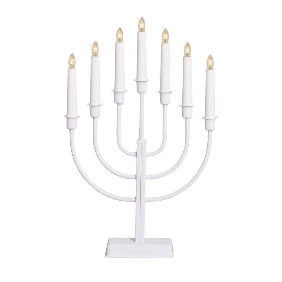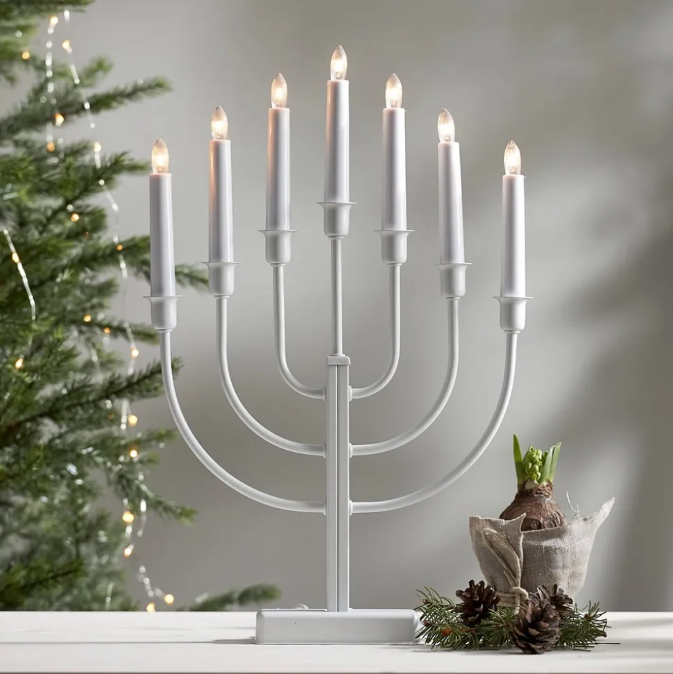 Kristina kandelaar met zeven witte kaarsen Deze kandelaar met metalen behuizing kan worden gebruikt om een elegante feestelijke sfeer te creëren. Hij maakt van de mooiste viering van het jaar een echt pronkstuk. Met zeven witte plastic kaarsen, elk met een E10 gloeilamp als vlam, zorgt Kristina voor een sfeervolle verlichting die accenten zet. Voorzien van schakelaar – Stekkersnoer: 1,8 m