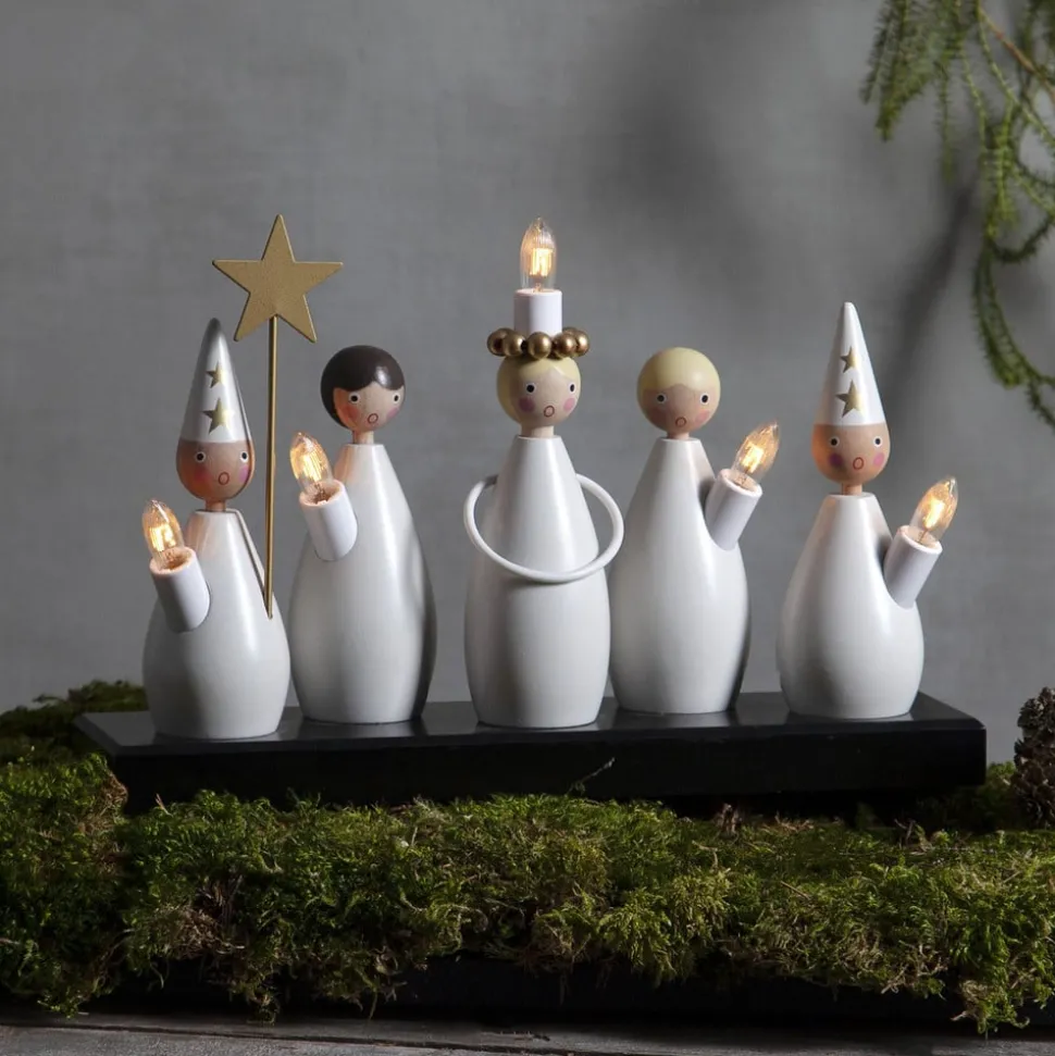 Betoverende Lucia Choir kandelaar – 5-lamps Met de figuren die lichtjes dragen en de figuur met de lichtkrans op zijn hoofd in het midden, is de Lucia Choir kandelaar een duidelijke herinnering aan het lichtfeest dat in Scandinavië elk jaar op 13 december gevierd wordt ter ere van de heilige Lucia. Een kerstdecoratie met een Scandinavische touch. Mite voorzien van een schakelaar op het snoer. Die lampen worden meegeleverd, geschikte vervangende lampen worden ook geleverd.