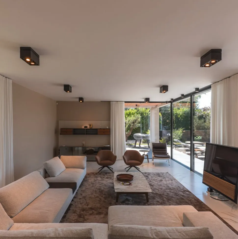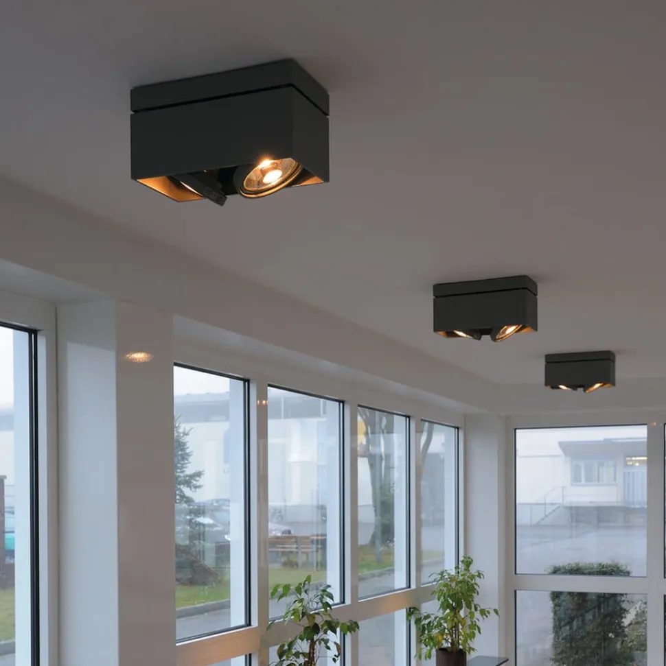 Kardamod plafondlamp met zwenkbare spots Gemaakt van hoogwaardig staal, de 2-lamps Kardamod plafondlamp. De spots die in de vierkante behuizing zijn verborgen, kunnen op een kardemont worden gedraaid zodat het licht naar wens kan worden gericht. Dankzij een ingebouwde transformator is Kardamod geschikt voor directe aansluiting op 230 V. Gebruikt in groepen is deze plafondlamp ideaal voor het verlichten van winkel- of commerciële ruimtes.
