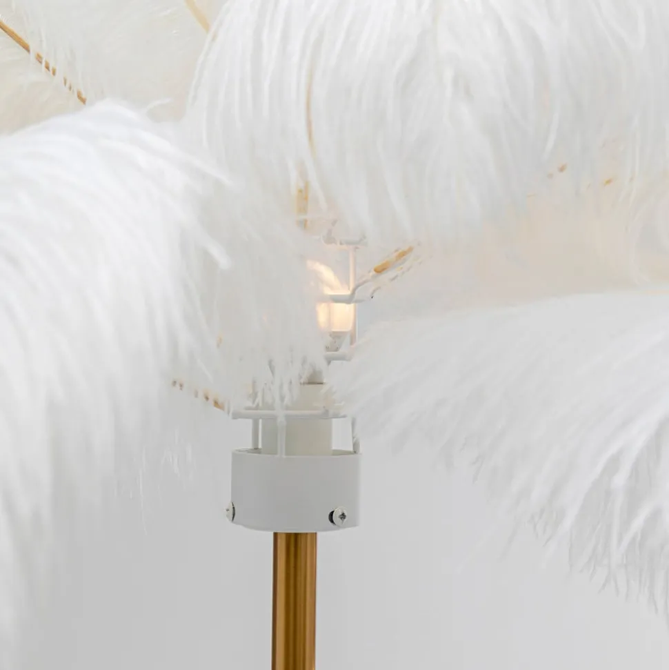 Vloerlamp Feather Palm met kap van struisvogelverenDe vloerlamp Feather Palm is een blikvanger in elke kamer, omdat de fitting tussen echte, uitstekende struisvogelveren zit, die als een palmboom aan de messingkleurige stang zijn bevestigd en bewegen bij het minste zuchtje wind. De lichtbron is in het midden van de veren geplaatst, waardoor de palmboom van binnenuit wordt verlicht en er een heel gezellige sfeer ontstaat. De Feather Palm vloerlamp brengt een wow-effect in elke kamer. Hij is uitgerust met een voetschakelaar in het snoer.