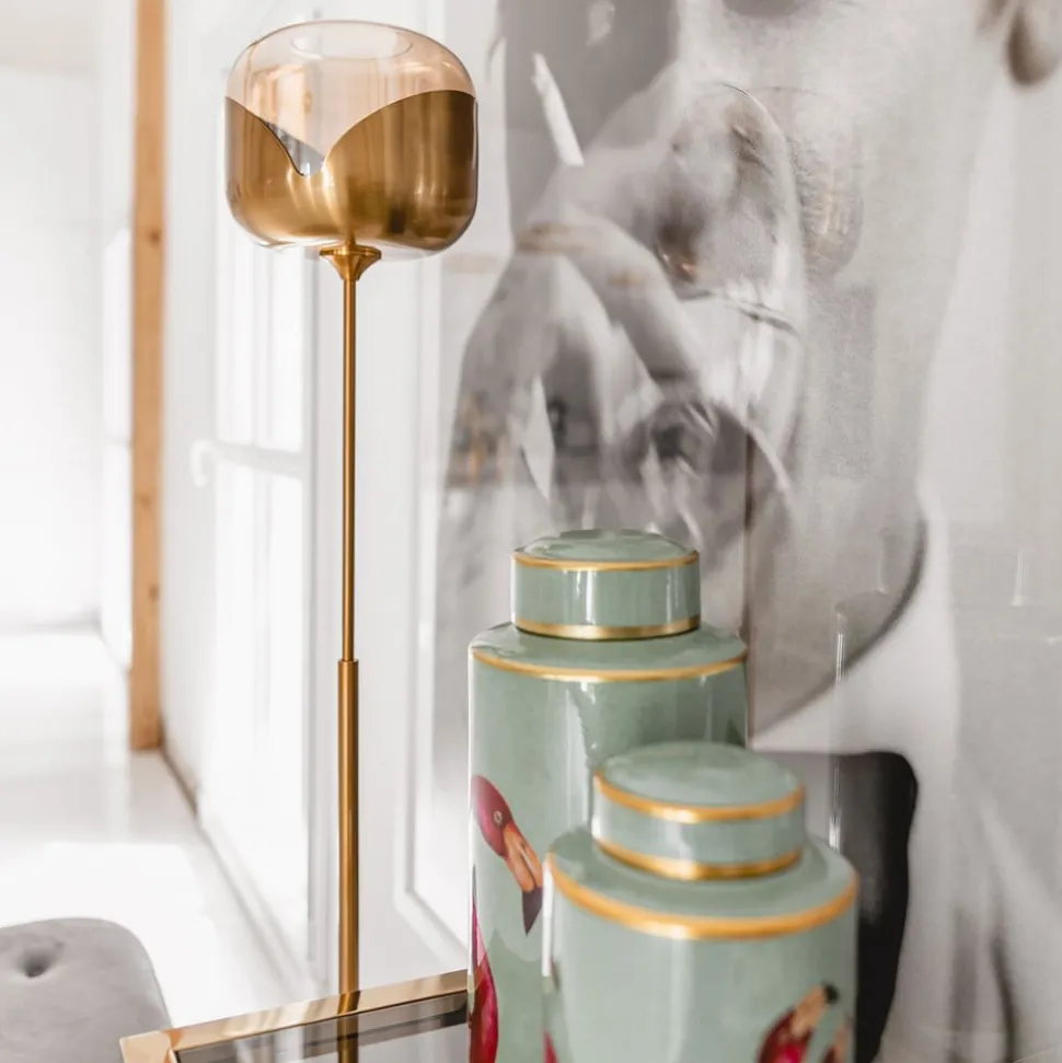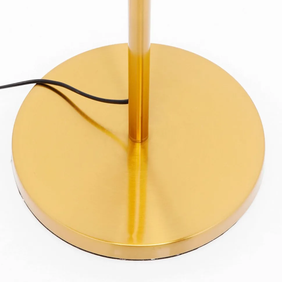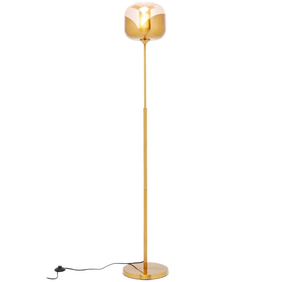 Vloerlamp Golden Goblet Ball in warm messing met getint glas De vloerlamp Golden Goblet Ball van Kare heeft een verfijnde uitstraling en een gezellig lichteffect. De kap, die troont op het zeer eenvoudige frame, is gemaakt van glanzend messingkleurig metaal aan de onderkant en amberkleurig getint helder glas aan de bovenkant. In combinatie met andere lampen uit de serie Golden Goblet kan de lamp worden gebruikt om een hele kamer op een stijlvolle en elegante manier te verlichten, zowel in een modernere sfeer als in klassiek ingerichte huizen. De lamp is zichtbaar door het licht getinte bovenste deel van de kap, waardoor het gebruik van een decoratieve lamp met gloeilampoptiek en helder glas bijzonder aantrekkelijk is.