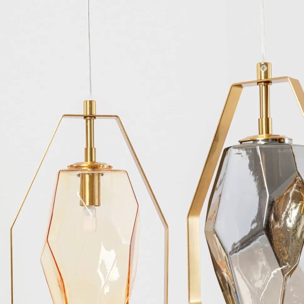 Vijflamps pendelarmatuur Diamond Fever DiningVanaf de lange kap van de pendelarmatuur Diamond Fever Dining hangen de vijf lampen op een gelijkmatige afstand. Deze bestaan uit een getinte glazen kap die visueel de vorm heeft van een geslepen diamant, een G9 fitting die erin zit en een smal metalen frame dat de hele kap omlijst. De lange kap en de metalen frames en fitting zijn ontworpen in dezelfde tint, de kappen zijn deels grijs, deels amber getint.