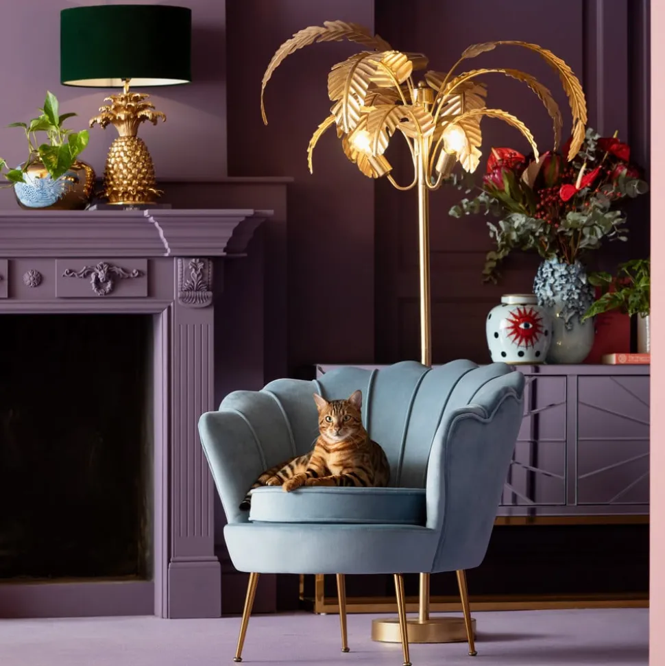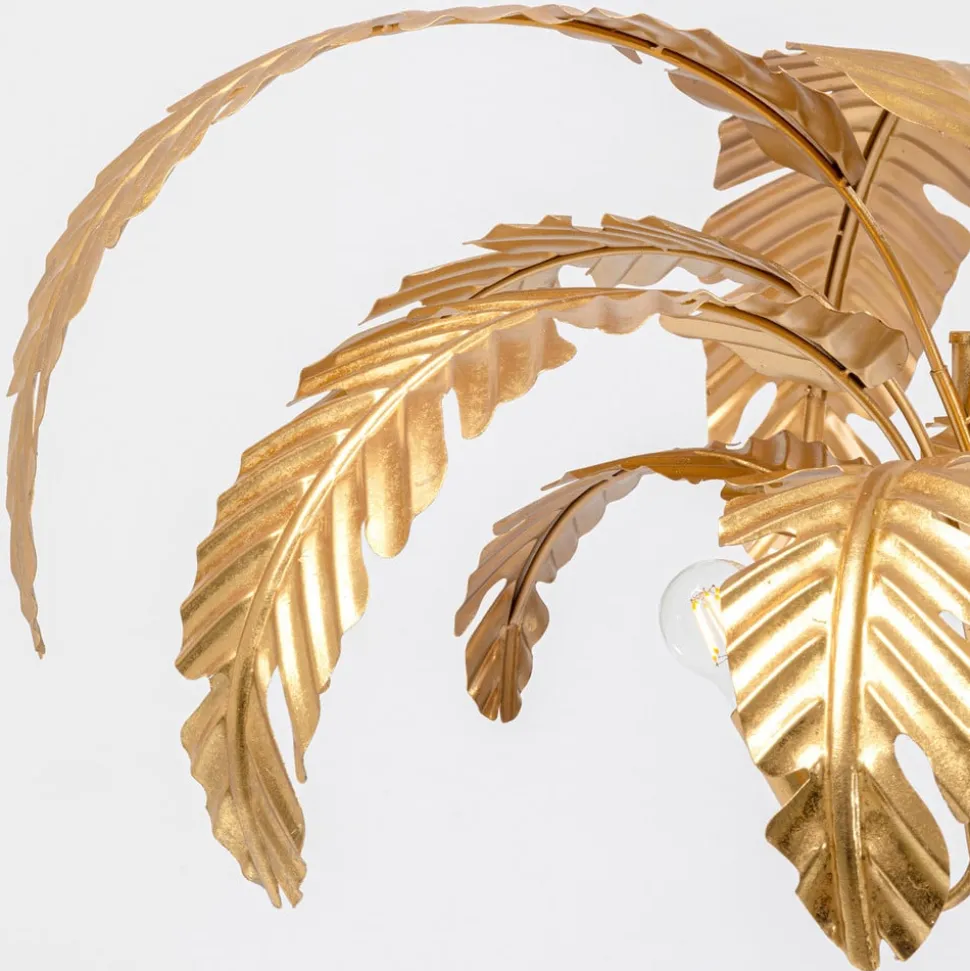 Messingkleurige Palmera vloerlamp met palmbladeren De manshoge Palmera vloerlamp geeft je dat vakantiegevoel. De lamp is gemaakt van messingkleurig staal en de lampenkap is ontworpen in de vorm van verschillende palmbladeren. Het buitengewone ontwerp combineert de glamoureuze stijl van de jaren 20 met een portie tropische flair en creëert een WOW-effect in elke woonkamer. Als de Palmera is uitgerust met verlichting van uw keuze, zorgt deze voor een aangename en sfeervolle verlichting, waardoor een aantrekkelijke sfeer wordt gecreëerd. – De levering is gedeeltelijk gedemonteerd