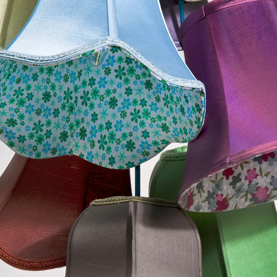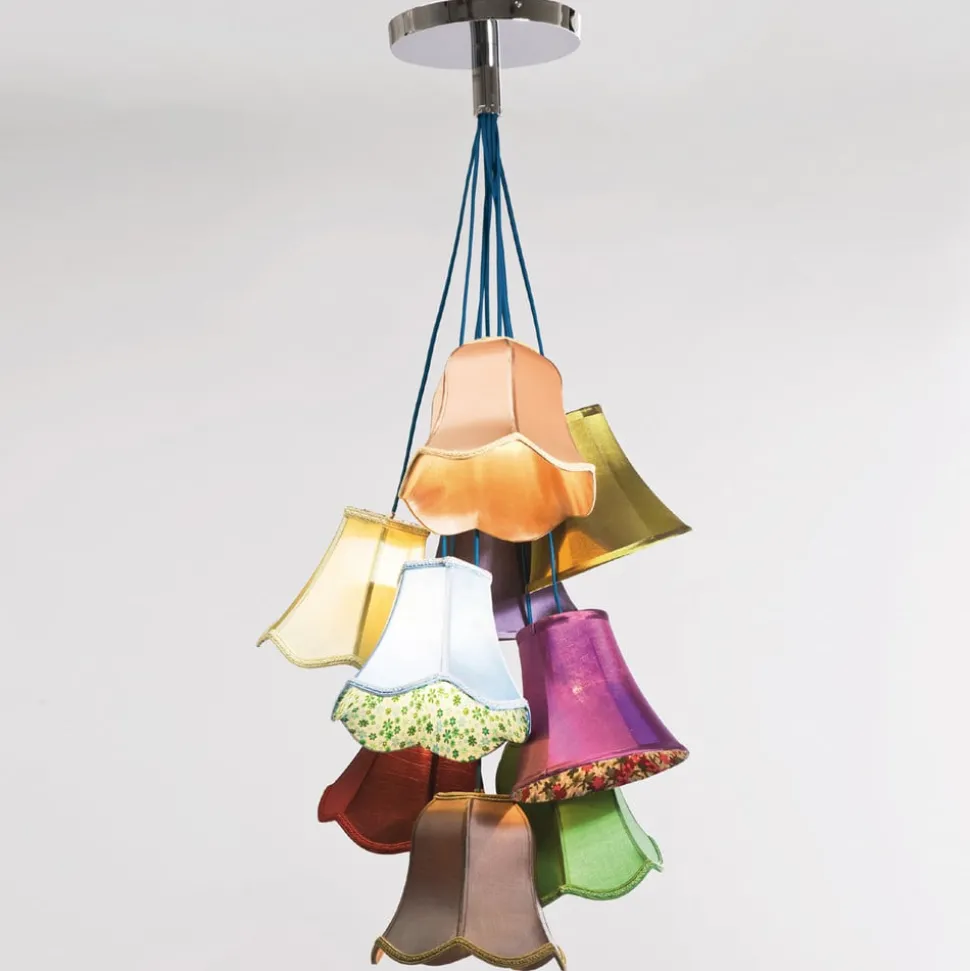 Kleurrijke SALOON FLOWER hanglamp met negen kappen in verschillende kleuren Je zou in de verleiding kunnen komen om te denken dat het kleurrijke rokken zijn die hier ronddwarrelen. Je hebt het misschien niet mis, want de hanglamp heet zeker niet toevallig SALOON FLOWER. Of je nu denkt aan de saloon uit de jaren 1920 of aan de saloon in het Wilde Westen, in beide saloons werd gedanst en genoten van het kleurrijke leven. De binnenkant van de klassiek vormgegeven kappen, waarvan sommige versierd zijn met bloemmotieven, is bijzonder aantrekkelijk.