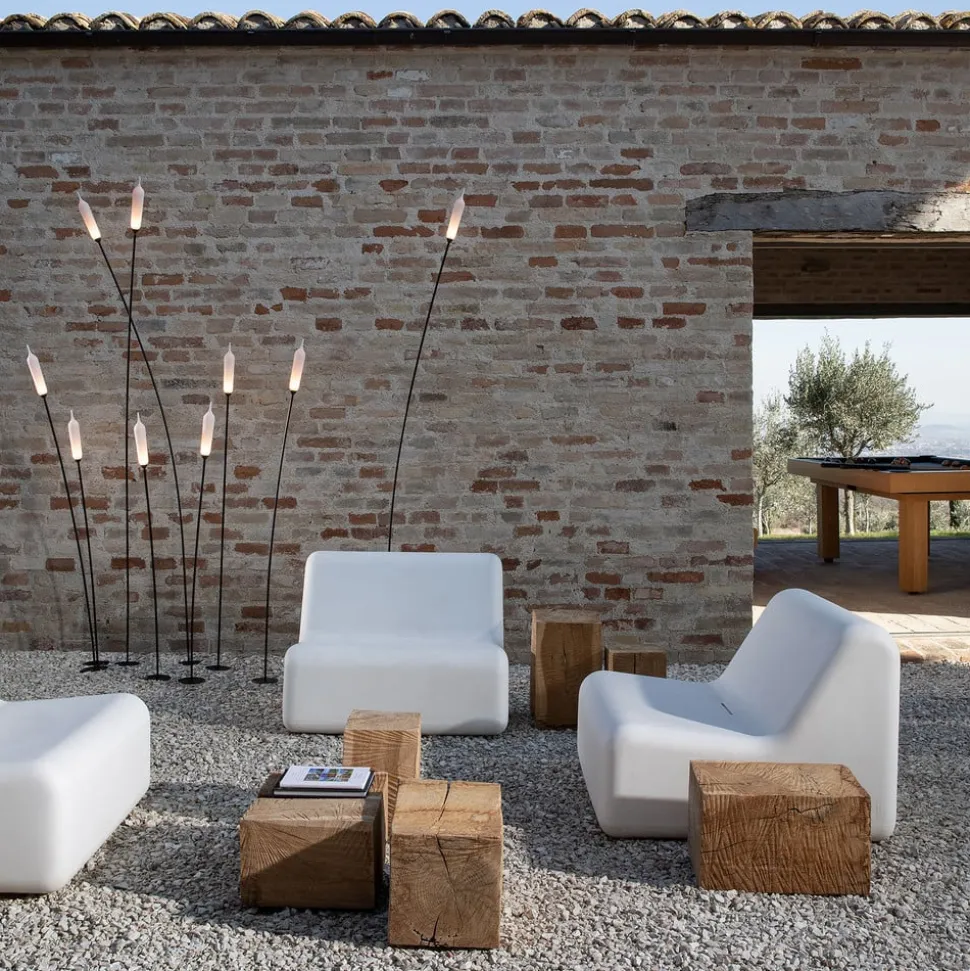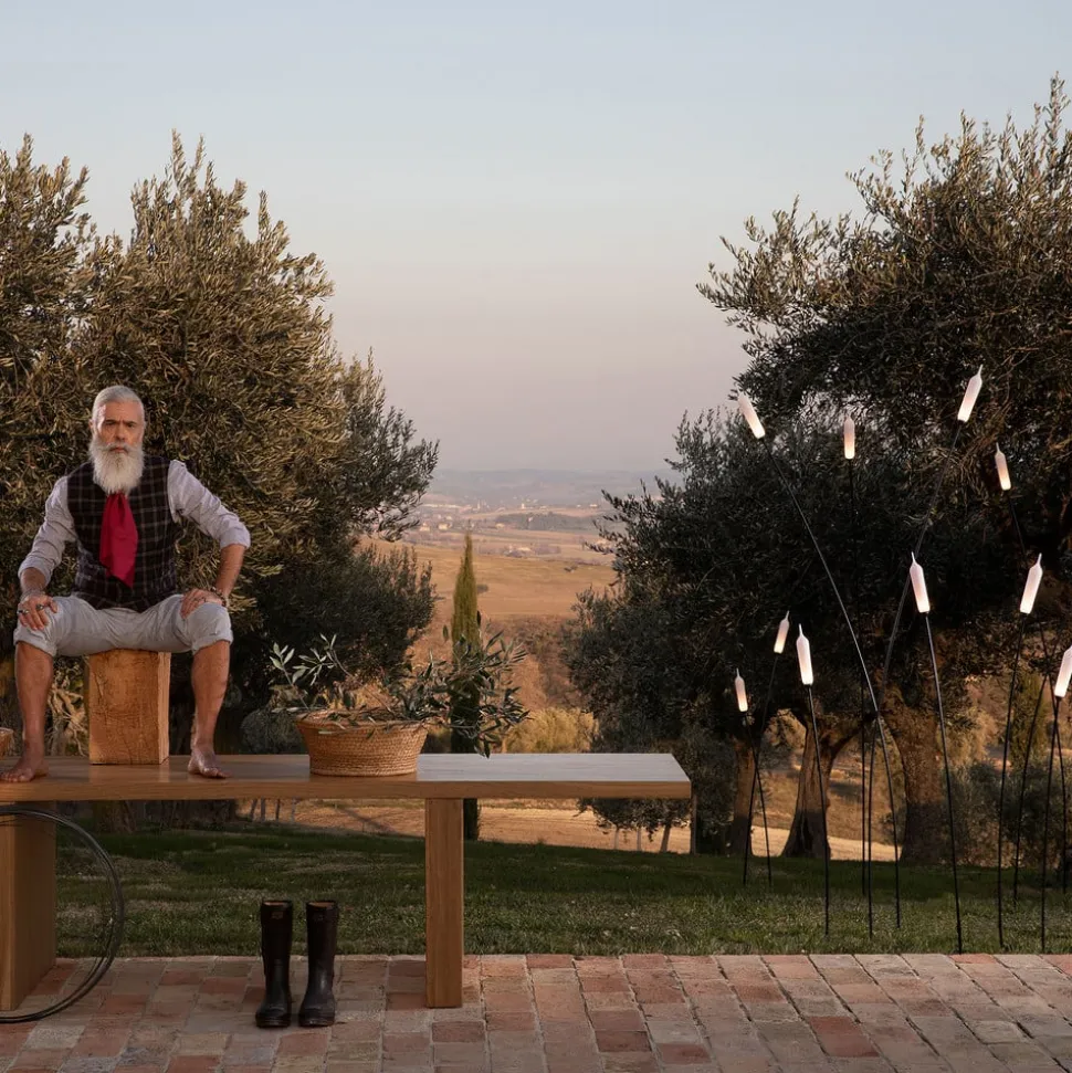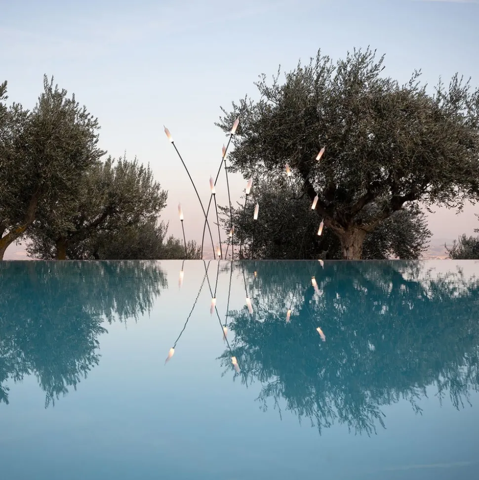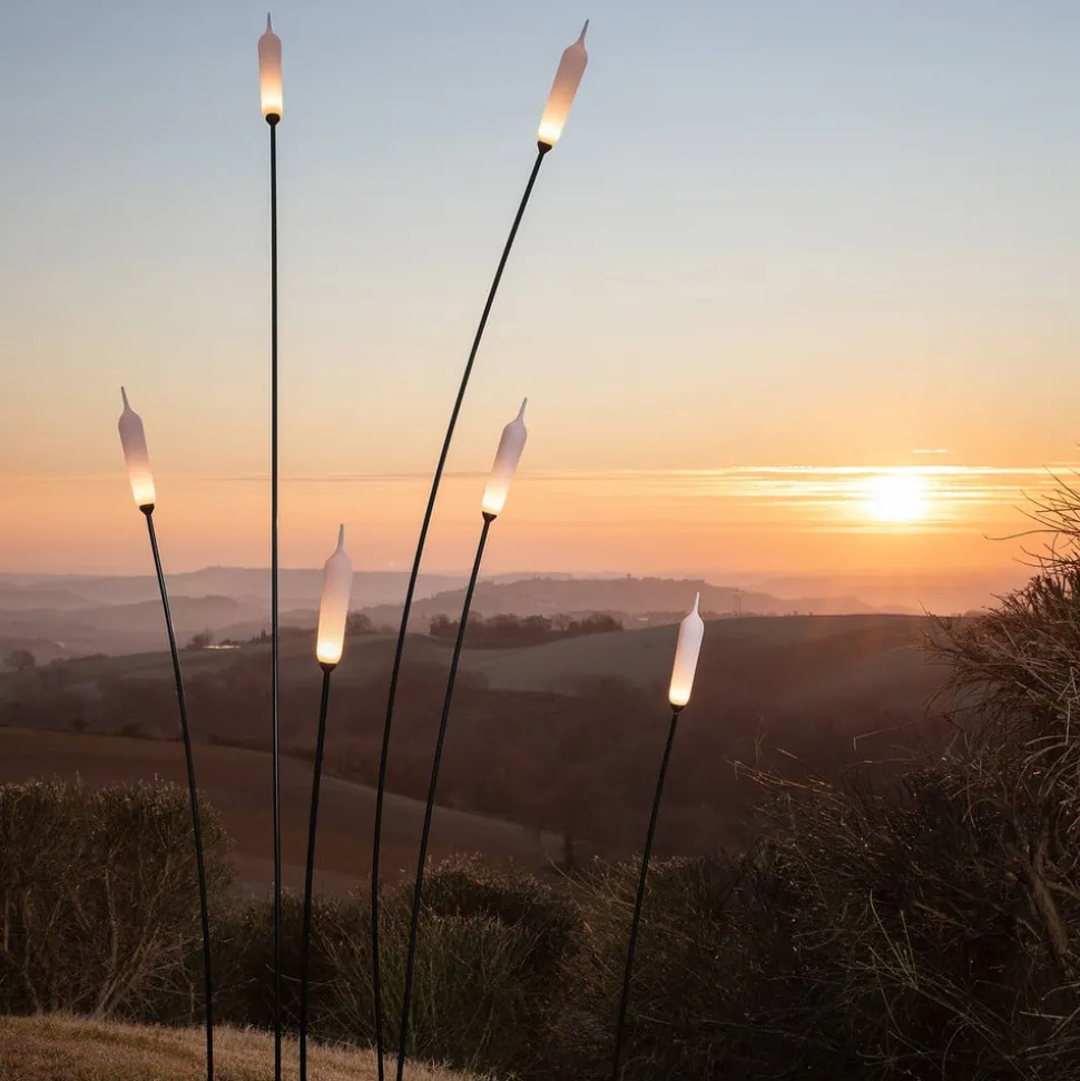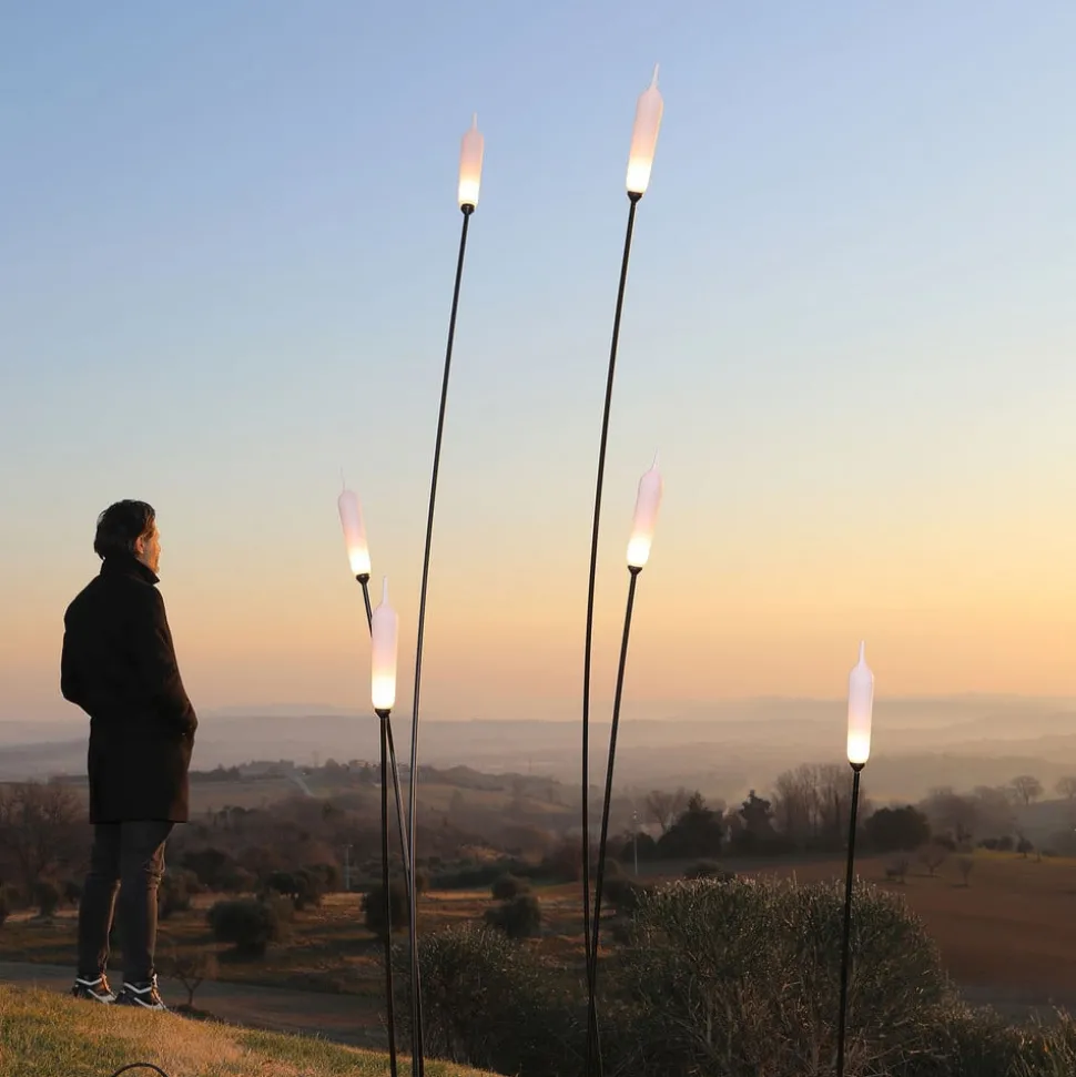 De aardpieklamp Nilo is een creatie van de ontwerper Matteo Ugolini, die met dit kunstwerk opnieuw uitdrukking geeft aan zijn verbondenheid met de natuur. Het is bedoeld voor gebruik buitenshuis, waar het alleen al het meest comfortabel is. De goed doordachte, interessante vorm is het resultaat van herinneringen aan een zomermiddag waarin het harmonieuze samenspel tussen een rivier en de planten die er groeien, wordt aanschouwd. Visueel gezien doet de vloerlamp sterk denken aan riet dat in de wind lijkt te schommelen.