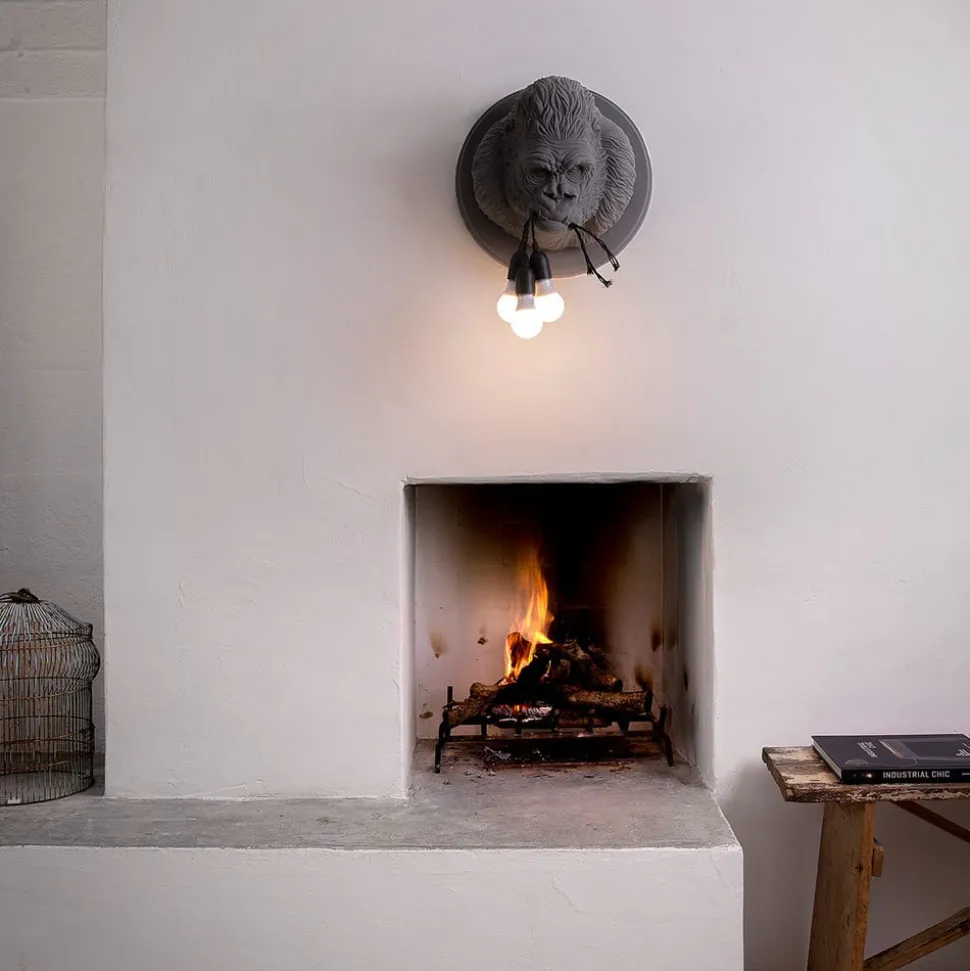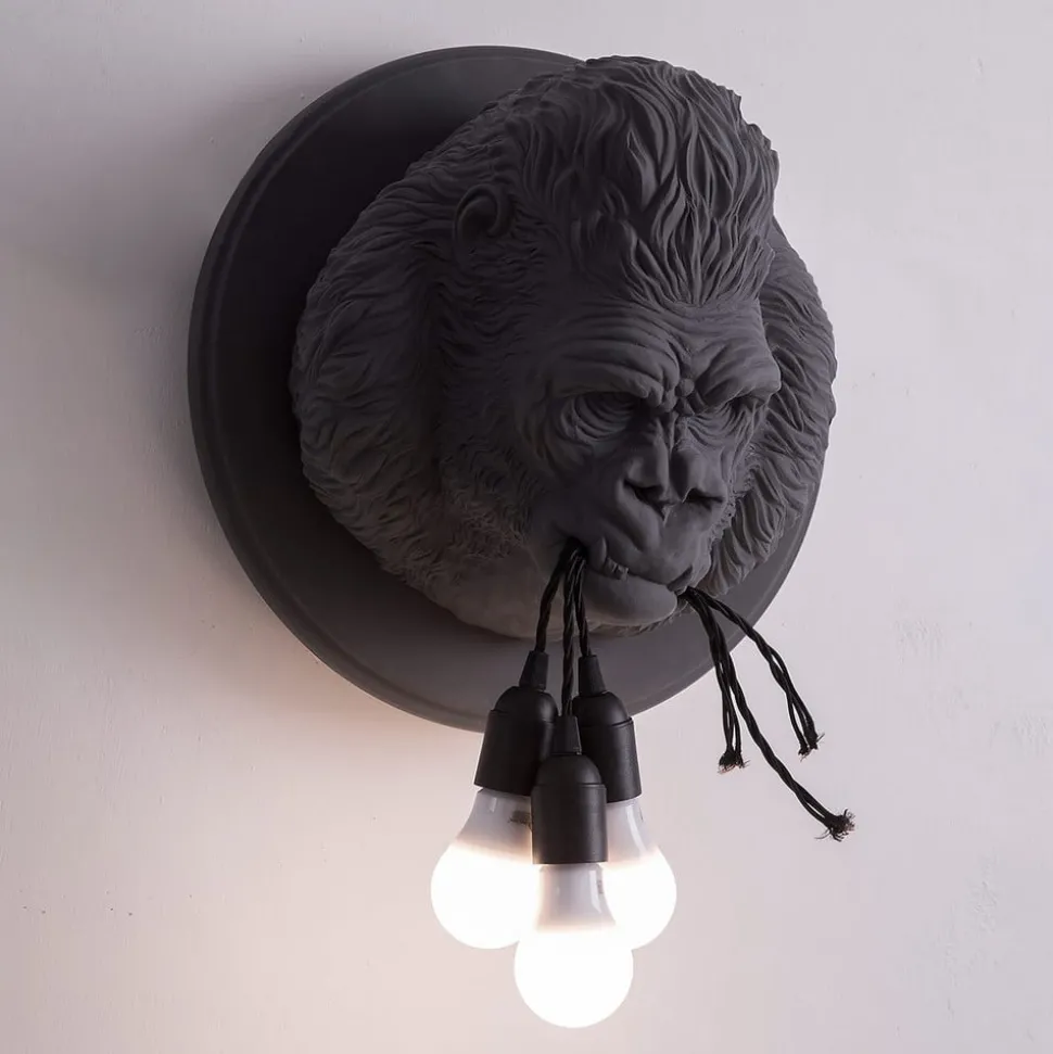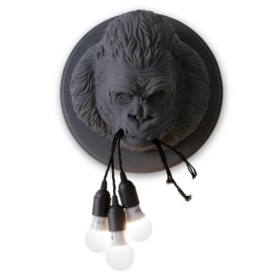 De gorilla met de drie afgescheurde lichte slingers in zijn mond kijkt boos naar je. Je kunt letterlijk de woede voelen die hem dreef om een van de grootste uitvindingen van de mensheid te vernietigen – het elektrische licht. In het geval van deze designwandlamp met de naam Ugo Rilla is het hem echter niet helemaal gelukt om hem te vernietigen, omdat de drie slingers die hij eraf heeft gescheurd nog steeds branden, of de stopcontacten kunnen worden voorzien van E27-lampen en opnieuw worden gemaakt om te schijnen.