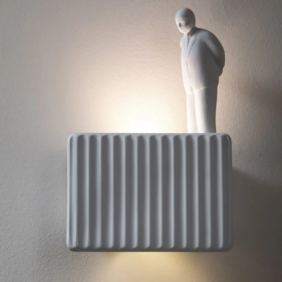 Deze decoratieve figuur van wit keramiek vervolledigt het concept van de LED-wandlamp Umarell van Karman. De ontwerper Giorgio Biscaro liet zich inspireren door een motief dat op veel plaatsen in Italië te vinden is. Hier volgen de senioren de gebeurtenissen op de bouwplaatsen in de openbare ruimte (Italiaans: Umarell) met belangstelling om de tijd te doden. In de Umarell-wandlamp lijken de figuren de lichtverspreiding waar te nemen en worden ze er zelf door in scène gezet – net als de levensechte Umarells, die alleen hun aandacht en hun eigen naam hebben gekregen door hun terugkerende aanwezigheid op de bouwplaats.