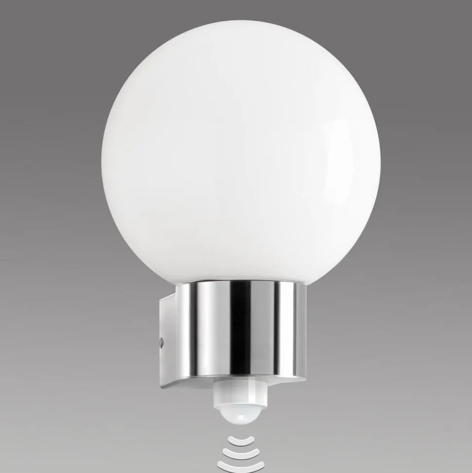 Aantrekkelijke buitenwandlamp Kekoa van roestvrij staal Klassiek bolvormig ontwerp, eersteklas afwerking en hoogwaardige materialen maken van deze buitenwandlamp een aantrekkelijk kwaliteitsproduct. Met haar opalen bolvormige glas zorgt ze voor een aangename helderheid zonder te verblinden en verhoogt ze de veiligheid rond het huis. Hoogwaardige materialen en hun gekwalificeerde en zorgvuldige verwerking kenmerken de buitenlampen van deze fabrikant, die allemaal in Duitsland worden gemaakt en uitgerust zijn met de modernste technologie. Technische gegevens bewegingsmelder: – Schakelvermogen: max. 120 watt – Installatie: 230 V / 50 Hz – Detectiehoek: ca. 120° – Tijdinstelling: 10 sec. – 8 min. – Schemerinstelling: 10 – 2000 lux – Bereik: max. 8 m