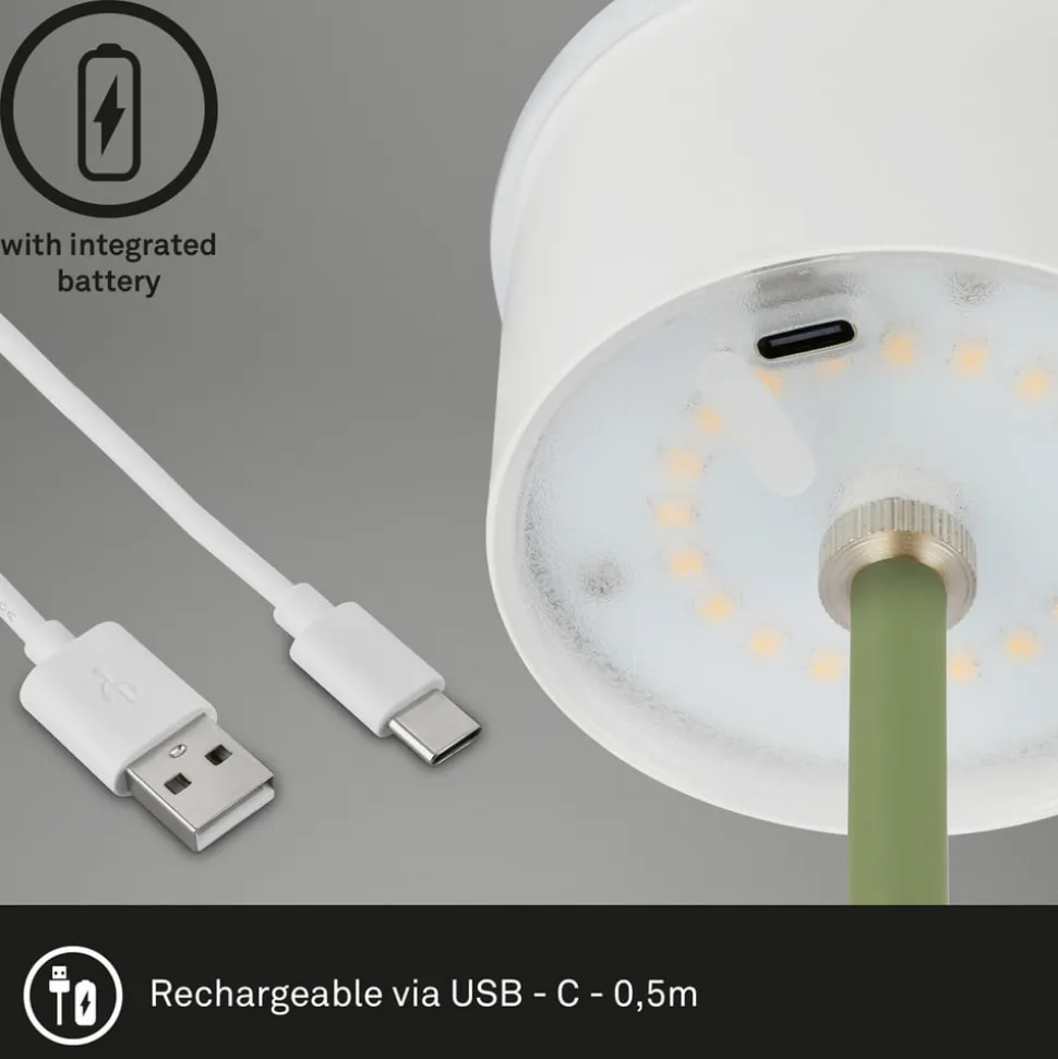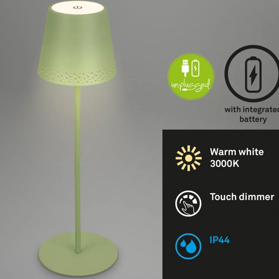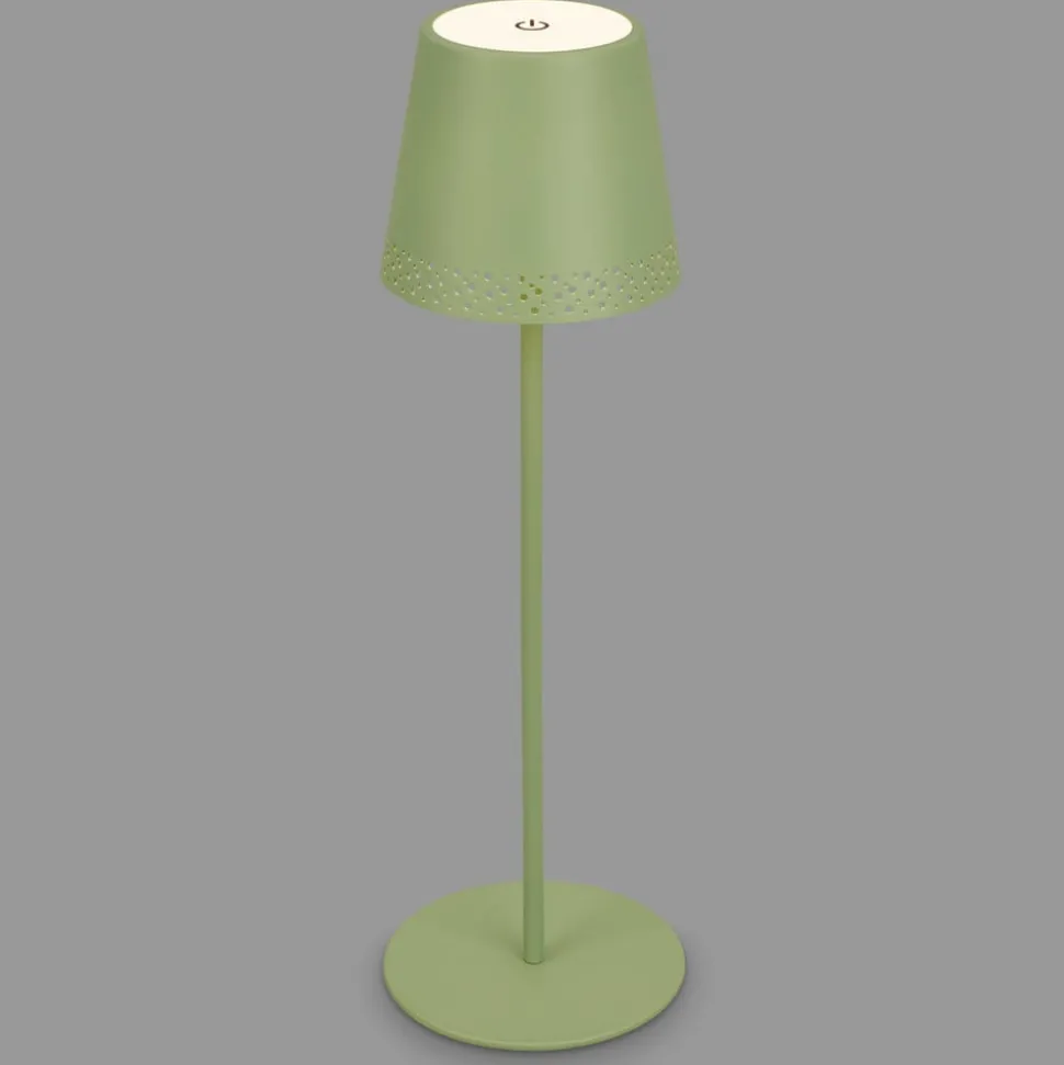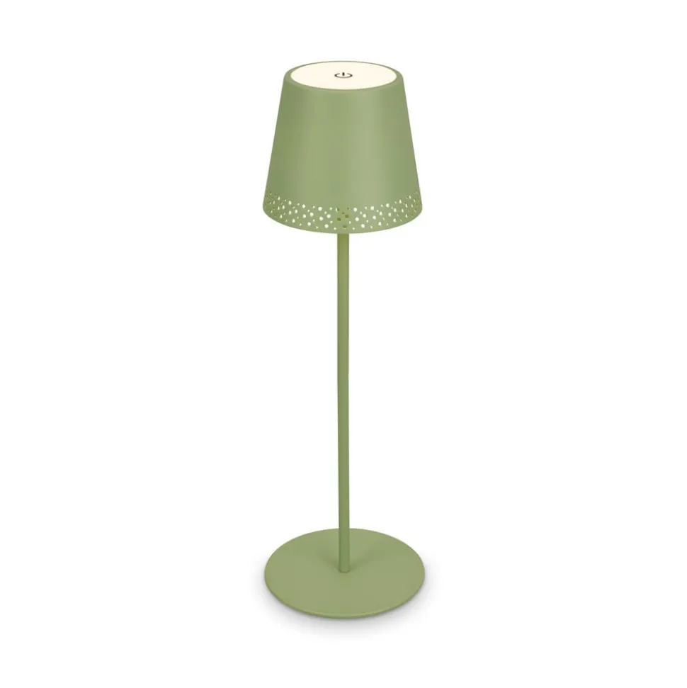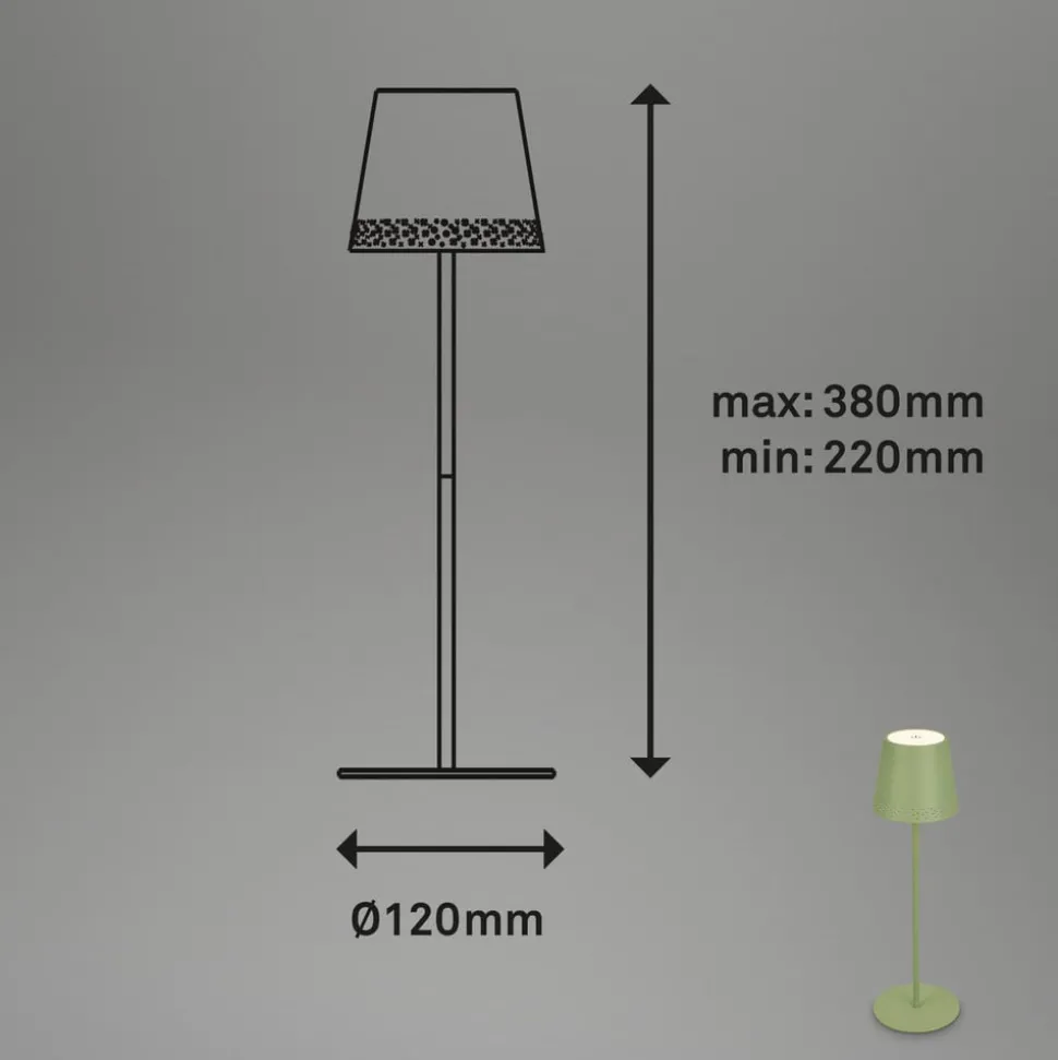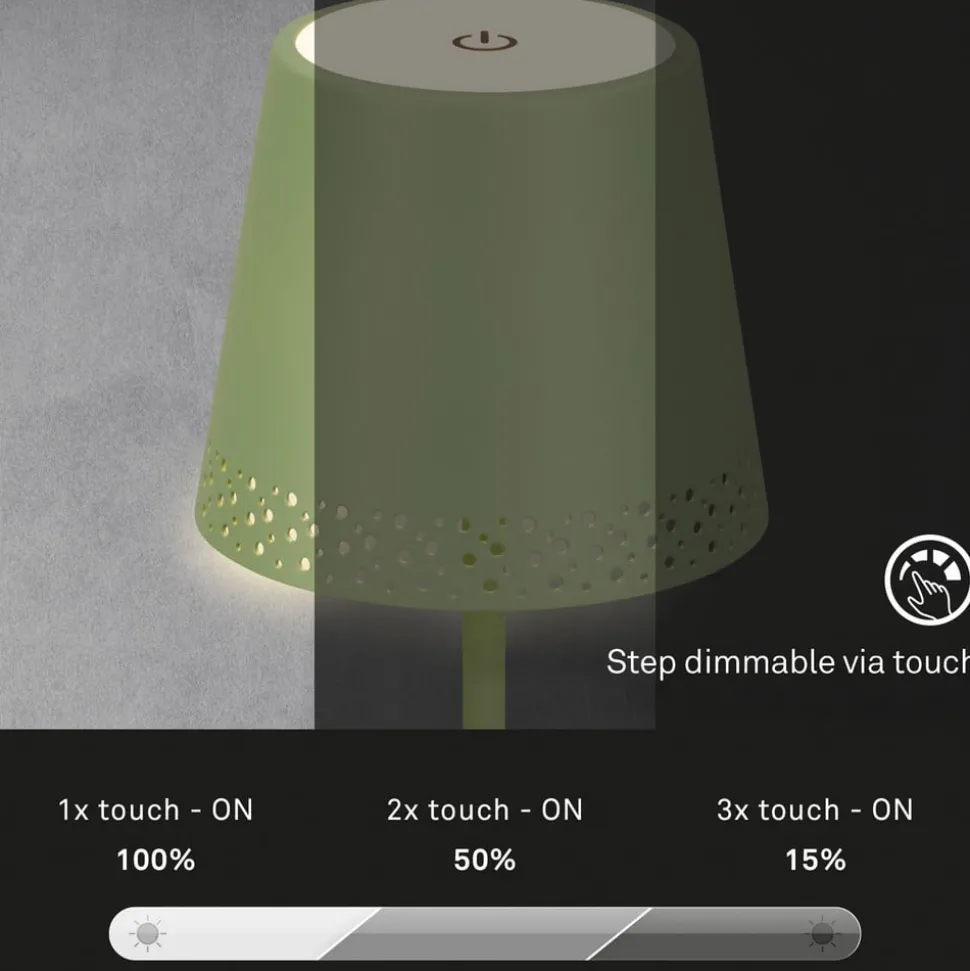 Dimbare LED tafellamp Kiki met oplaadbare batterij en warmwitte LED’s, in hoogte verstelbaarDe LED tafellamp Kiki op batterijen kan zowel binnen als in de tuin of op het terras worden gebruikt dankzij beschermingsklasse IP44. De mooie perforatie met een fijn gaatjespatroon aan de onderrand van de kap geeft de lamp een licht romantisch tintje.Het tweedelige frame met schroefverbindingen maakt een variabele hoogte mogelijk – als je één stang monteert, is de lamp 22 cm hoog, als je beide stangen monteert, is hij 38 cm hoog.De warmwitte LED’s die in de kap zijn ingebouwd, kunnen op drie helderheidsniveaus worden geschakeld door de aanraakschakelaar op de kap aan te raken. 1 x aanraken schakelt naar 100 n, twee keer aanraken schakelt naar 50% helderheid en drie keer aanraken schakelt naar 15% helderheid. De vierde aanraking schakelt de lamp weer uit.