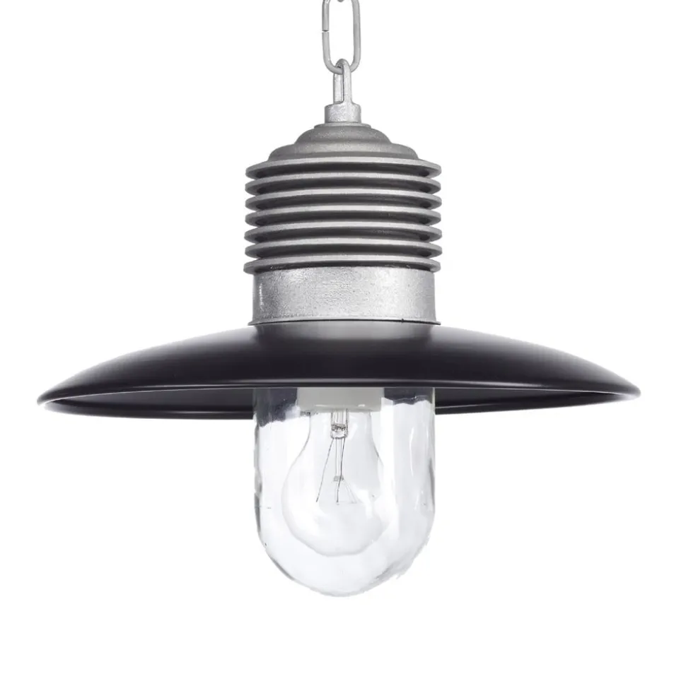 Buiten hanglamp Ampere aan stevige kettingophanging De buiten hanglamp Ampere wordt gekenmerkt door het klassieke ontwerp en de robuuste aluminium constructie, waarvan de ophanging en het frame zijn gemaakt. De armatuurbehuizing van helder glas zorgt voor helder licht, waardoor de armatuur ideaal is voor sfeerverlichting in fabriekshallen, werkplaatsen enz. Ampere heeft een beschermingsgraad IP44, d.w.z. dat het is beschermd tegen het binnendringen van spatwater en vaste vreemde voorwerpen met een diameter van 1 mm. Inclusief 1 meter kabel.