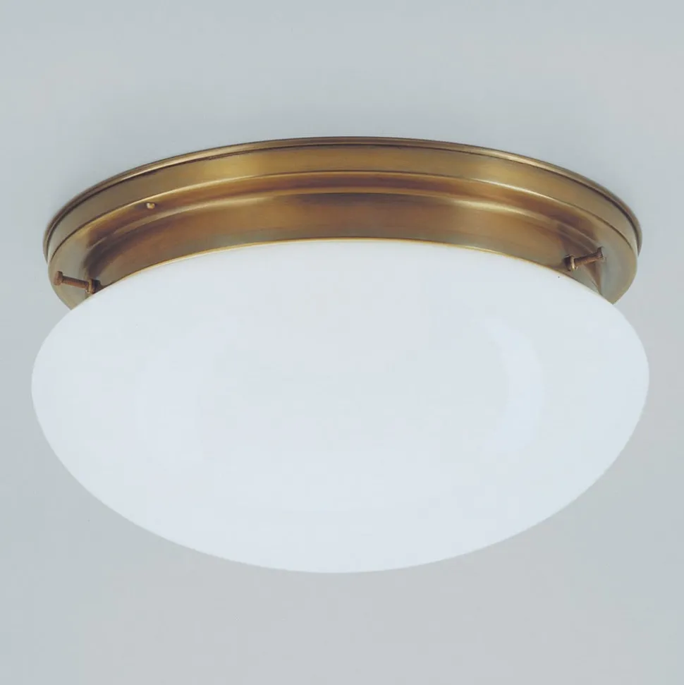 Ronde plafondlamp Harry met glanzend wit glazen kapDe plafondlamp Harry is gebaseerd op oude patronen en modellen van rond 1900. Het is handgemaakt met gebruik van voornamelijk puur messing onderdelen. De glazen kap van geflatteerd glas is mondgeblazen; het sierlijke frame daarentegen heeft een speciale oppervlaktebehandeling ondergaan waarbij een patina in het messing is geverfd en niet geschilderd. Het resultaat is een uiterlijk dat bijna niet te onderscheiden is van het originele patina van antieke lampen. Voor het schoonmaken heeft een droge doek de voorkeur; een lichte glans kan worden verkregen door te wrijven met een beetje olijfolie.